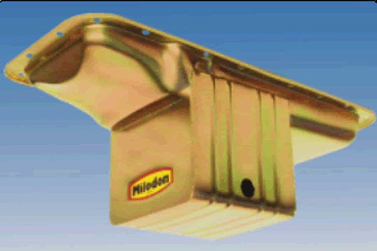 Above Left: Milodon is highly recognized as an industry leader in oil control systems. The deep wet sump oil pan fits nicely under a big-block wedge or Hemi. Above Right: Milodon has high-strength, four-bolt mains for Mopar engines.
