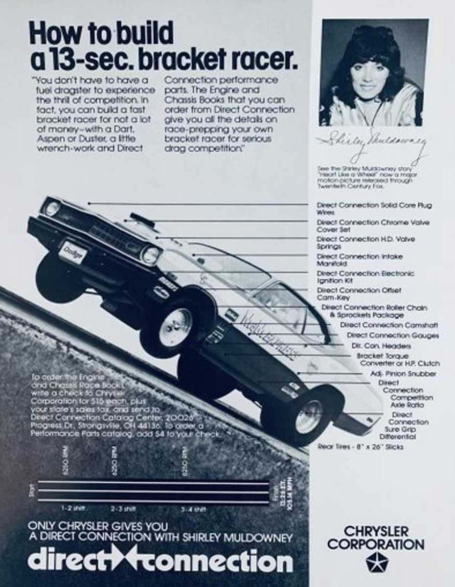 Above Left: Top Fuel pilot Shirley Muldowney was sponsored by Direct Connection for several years. Direct Connection took the opportunity to discuss one of the recipes for building a 13-second car. Above Right: An early Mopar Engine Modification book discussed performance improvements for FWD 2.2, six-cylinder, eight-cylinder, and imports.