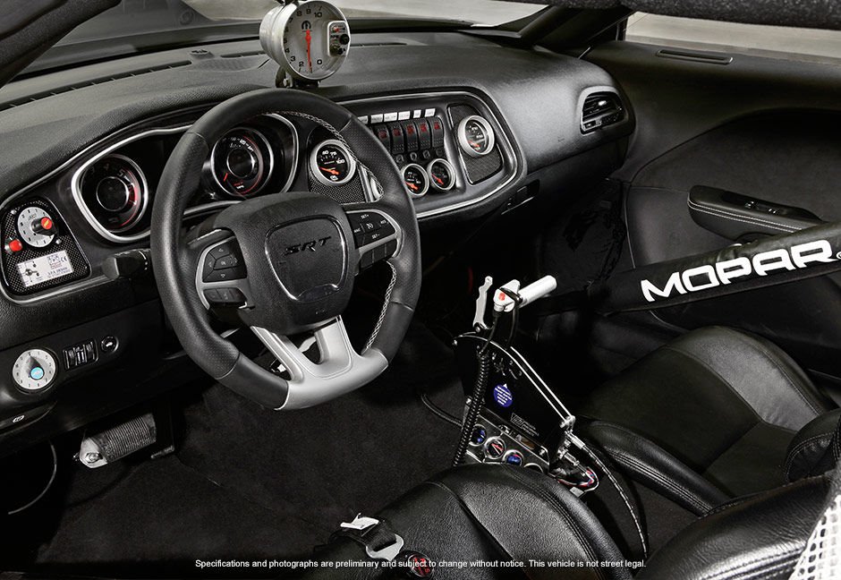Also new for 2015 is a redesigned full roll cage fabricated to NHRA specifications and interior with much of the Dodge Challenger interior retained, but with a Mopar gauge pack, driver and passenger lightweight racing seats, safety net and a five-point harness.