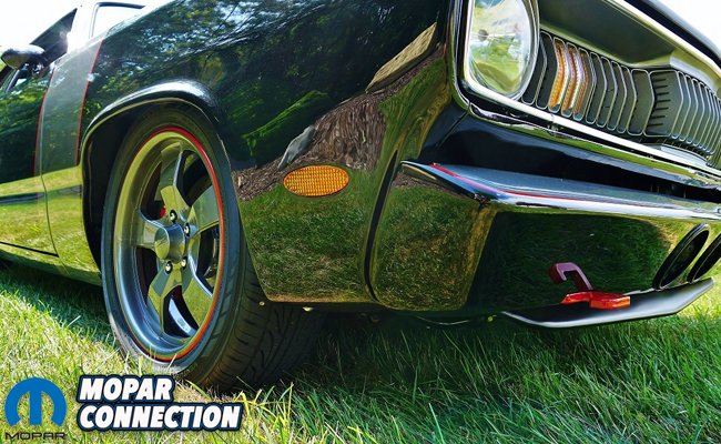 Out front sits a beautifully restored sharktooth grille that houses custom LEDs behind the original lenses. Once all of the fabrication work was complete, Ross’ Duster was sent to Tom Bodalski of Bodacious Cycle Paint Works where it was sprayed in Black two stage base coat/clear paint from BASF. Once it was sprayed black, it was then accented with Dodge Mineral Grey and a Dodge Viper Red pinstripe on the hood, fenders, and bumpers.