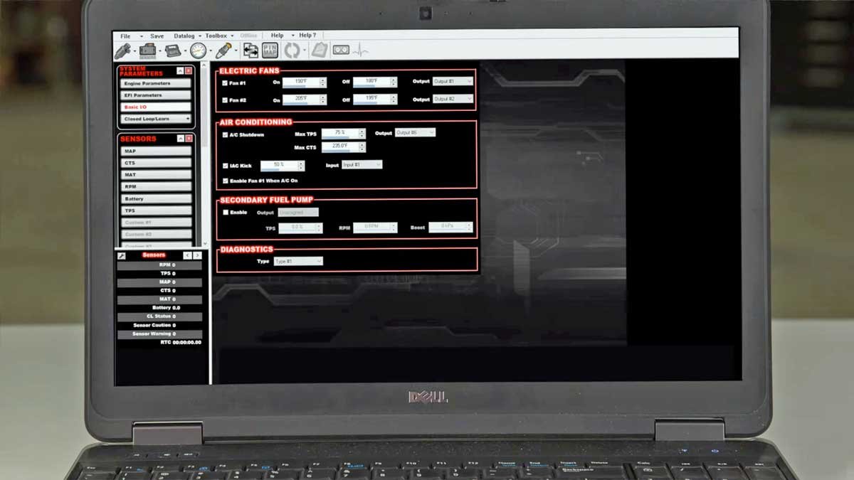 Left: A new feature of the Atomic 2 is the touchscreen controller. The controller is used for the Atomic setup, adjusting the fuel injection parameters, and as a gauge monitoring device. Middle: Custom tuning is available with the computer-based Advanced Tuning software. The Atomic 2 can handle power adders such as turbochargers and superchargers. Right: Incorporated into the Advanced Tuning software is a fan controller for one or two electric fans. The tuner can adjust the engine idle for increased engine loads from the air conditioning compressor. The software can control a second fuel pump. If a sensor’s output falls outside of the acceptable parameters, the software can provide trouble codes.