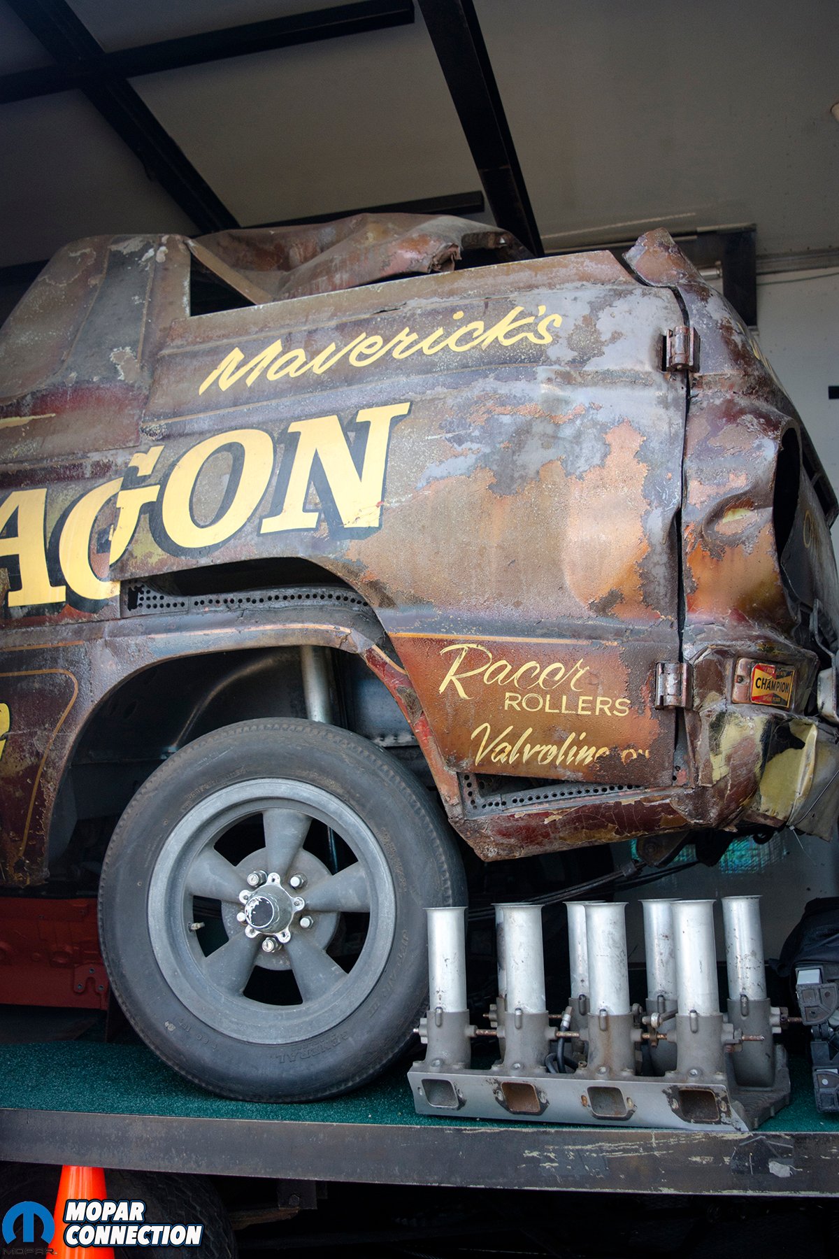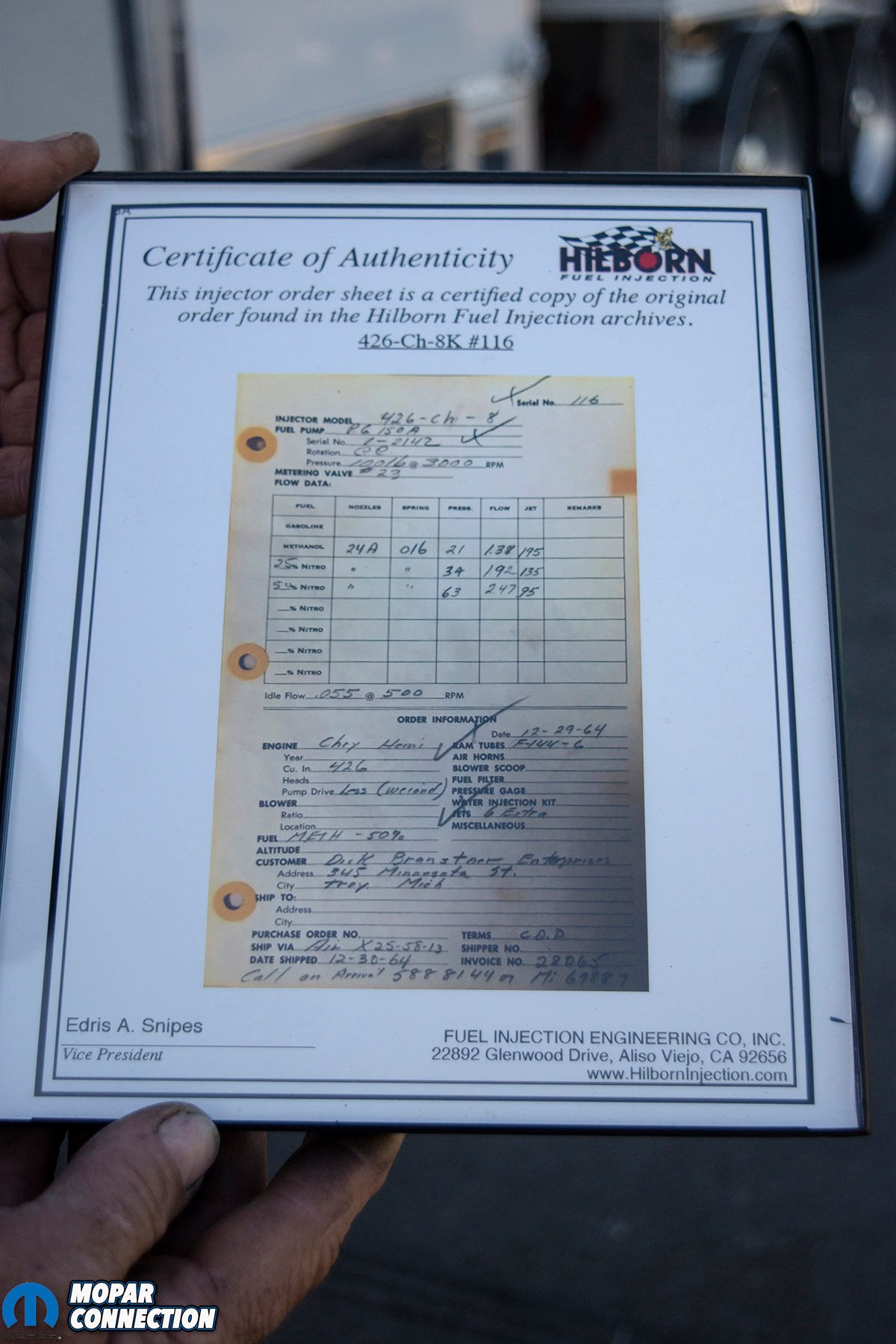 Mantel was able to tell the story of the original Little Red Wagon, and stated that it was in fact the real deal. A Certificate of Authenticity from Hilborn showed that the injection system, number 116 was originally purchased by Dick Brantster, who owned the car in 1965, along with a copy of the original invoice from Hilborn. The original Little Red Wagon still retains its magnesium American Racing Torq Thrust wheels from the 1960s.
