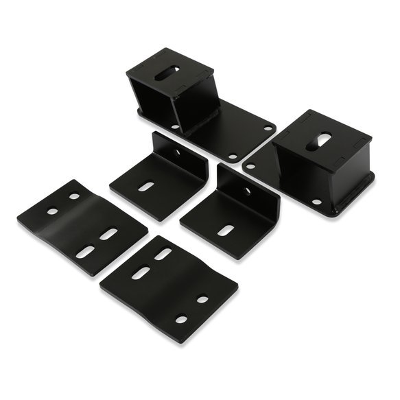 The BlackHeart engine swap mount kit includes mounting brackets, frame plates, engine isolators, and mounting hardware. Welded steel construction with a black powder-coated finish for durability and corrosion protection is used.