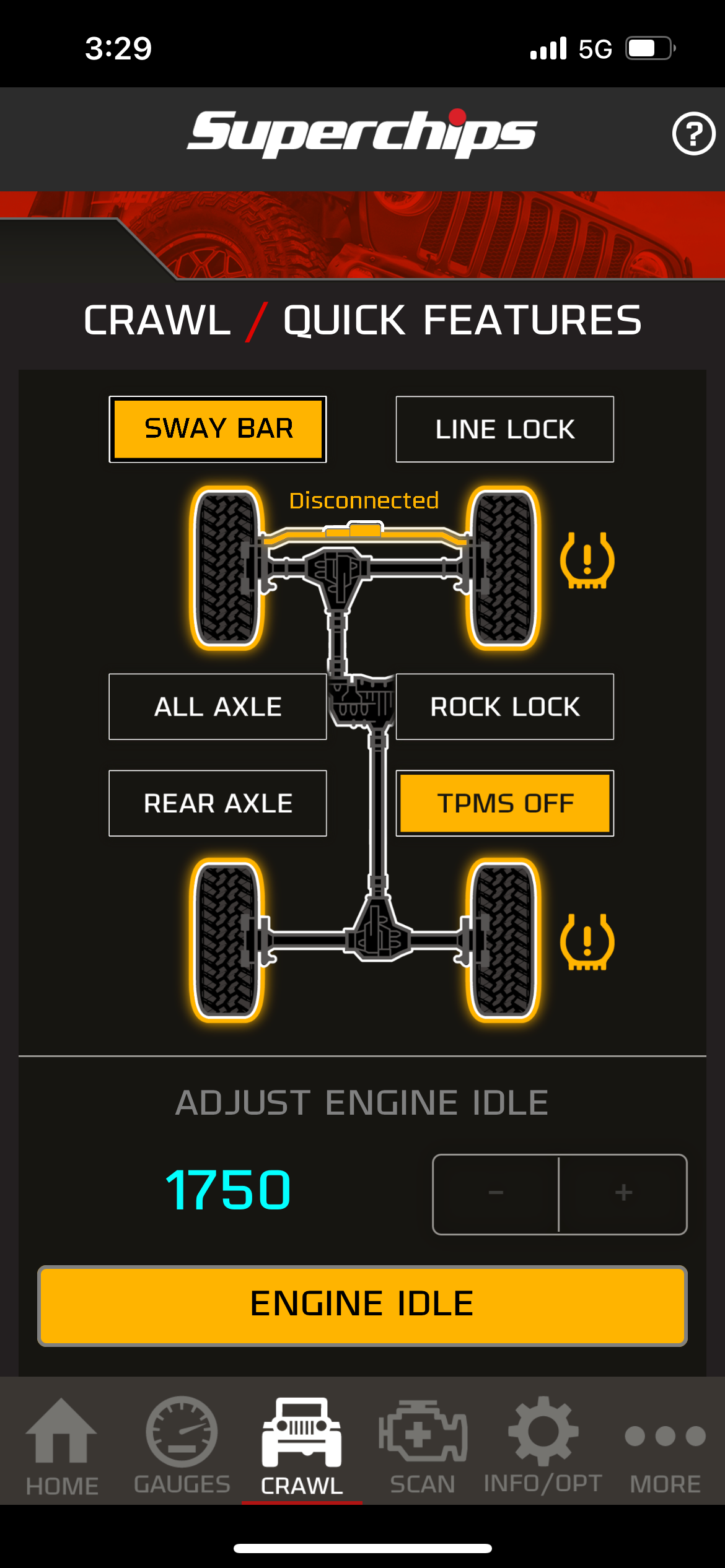 The all new CRAWL screen functions as drivetrain’s command center with live and on-the-fly interface and no need to stop and reprogram the BCM, all through the touchscreen of your smartphone. Allowing Rubicon owners use lockers in 2wd and 4-HI while also extend the 25mph limit all the way up to 55mph.