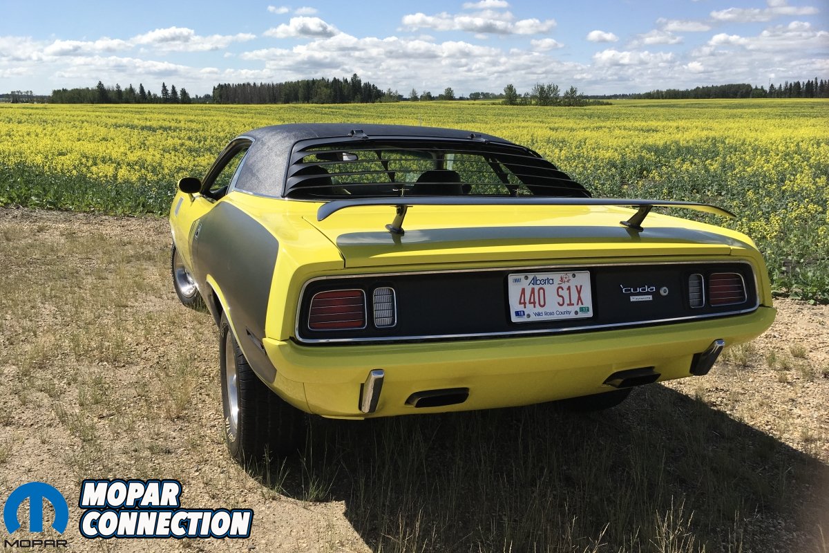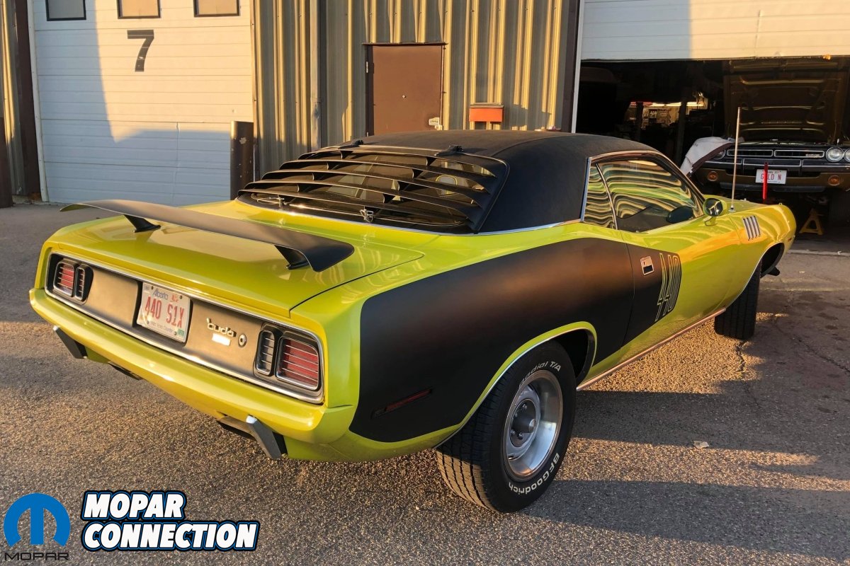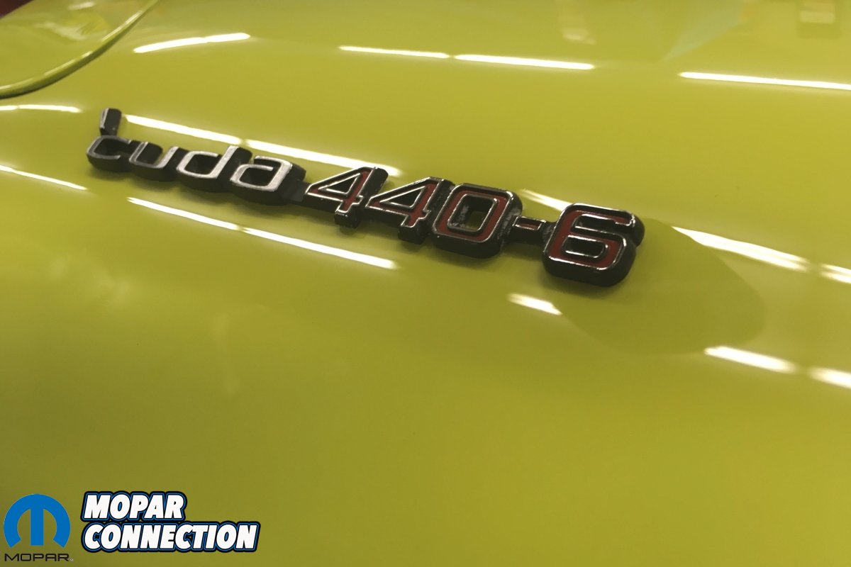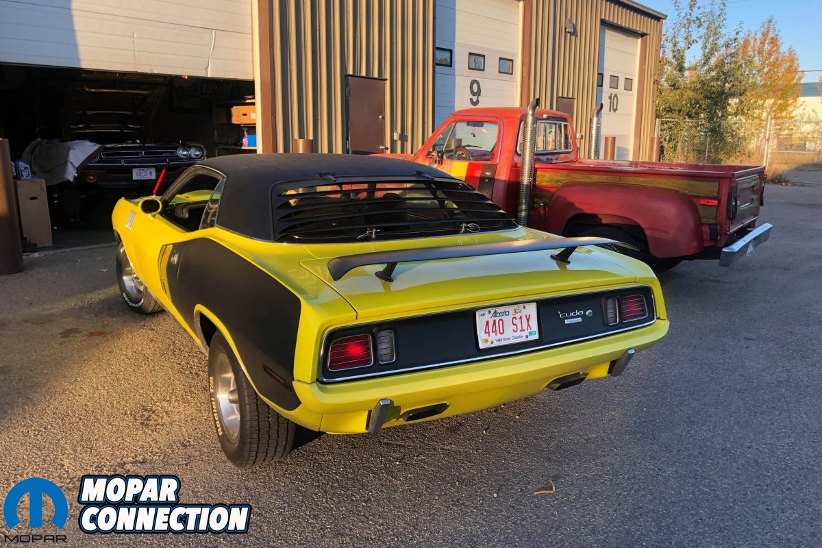 “The car was coded for a black vinyl top and elastomeric bumpers so a set of bumpers were purchased from Jean Gregory. I then sent the ‘Cuda to Rob Polson at Prairiefire Paint in Consort, Alberta where he installed the vinyl top and also installed and painted the rear window louvers, grille, radiator support, and the correct 1971 hood.”
