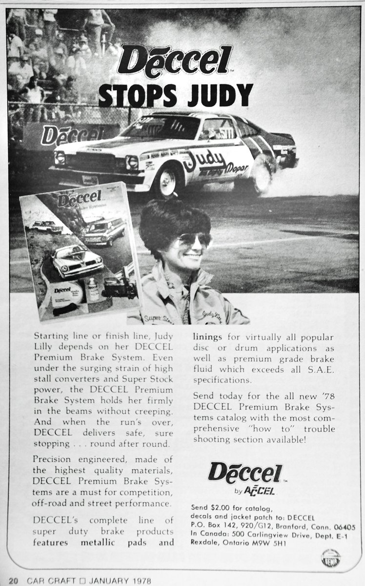 Super Stock (SS) eliminator star Judy Lilly and crew chief/husband (at the time) Dennis Maurer found it crucial to gain an advantage on the competition, so they equipped her Mopars with the Deccel Premium metallic pads and linings. The Deccel superior friction material firmly held her foot-braked Plymouths in the starting beams, and after a triple-digit MPH quarter-mile run, they safely and dependably brought her rides to a halt.