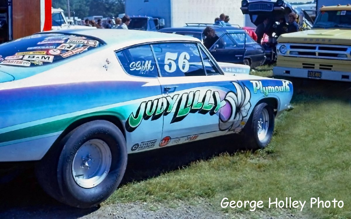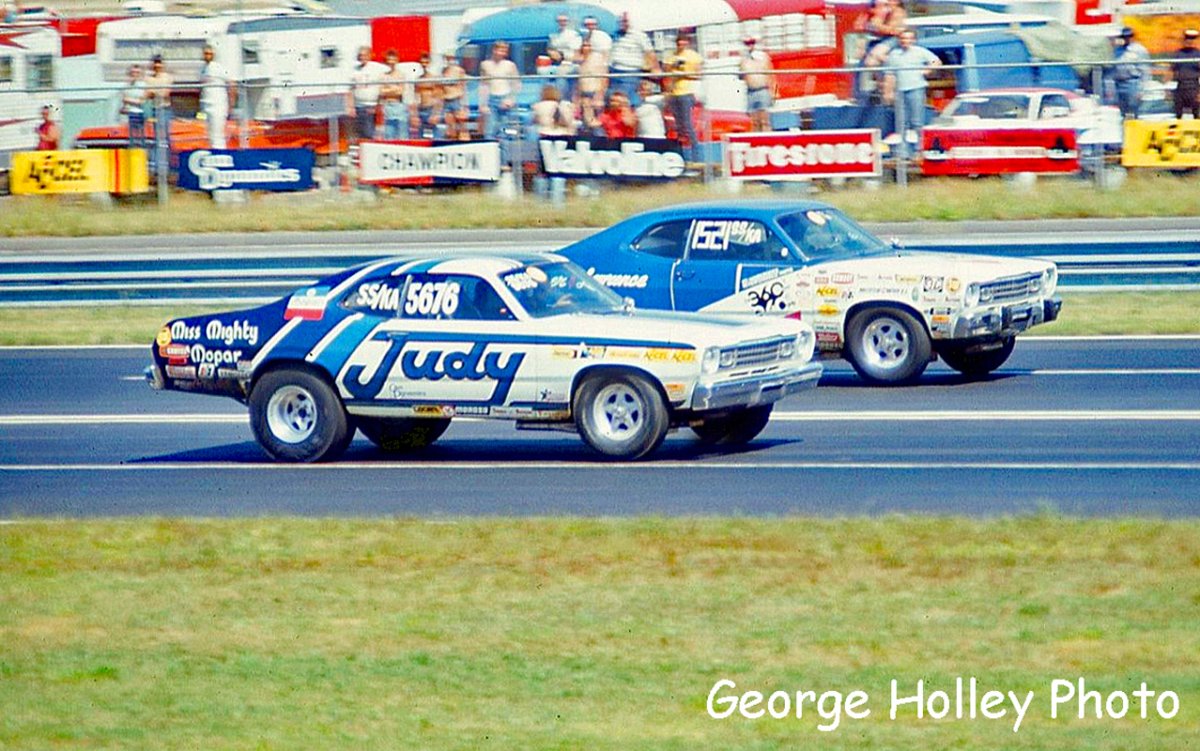 Above left: Lilly’s ’68 Hemi Barracuda had several paint jobs until she earned Mopar (Direct Connection) sponsorship in ‘72. The ’68 ran in SS/BA, and it moved up to SS/AA after a few years of competition. The photo was shot in the pits at the NHRA Springnationals in Columbus, Ohio, in ’72. Above right: By ’74, Mopar wanted Lilly in a more contemporary ride, so a 360 Duster was selected. Lilly continued her winning ways with the Duster. This photo was shot at the NHRA Summernationals in Englishtown, NJ. It looks like a class runoff (both SS/KA cars), and Lilly has a fender on an equally equipped Duster driven by Ed Hamburger.