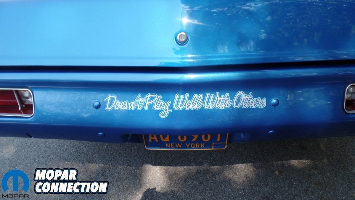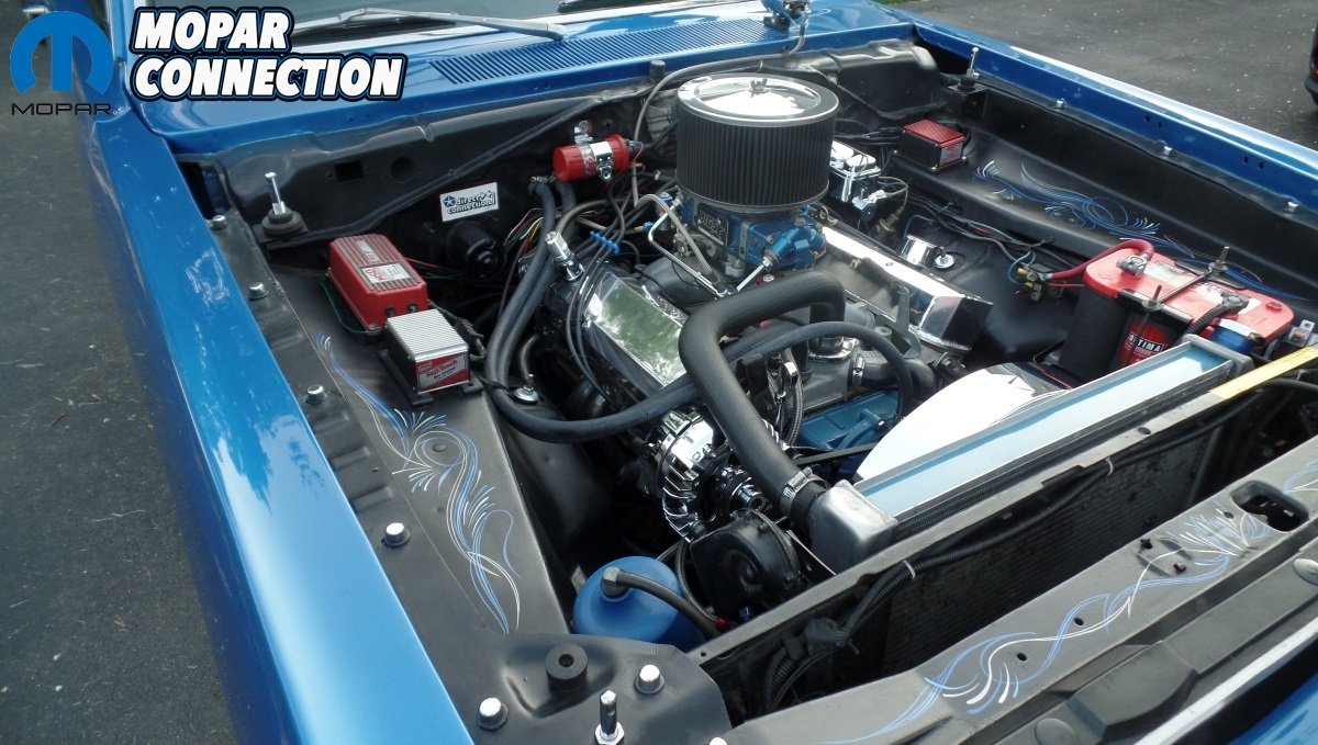 On the inside, Fred’s Dart was treated with a pair of Procar Sportsman Racing seats and a new headliner. Everything else as previously mentioned came from Fred’s original wrecked ’70 Swinger 340. The interior also features a Kenwood Stereo with Kicker speakers, Stewart Warner gauges and an AutoMeter tach and fuel pressure gauge. Shifting is done through a Mr. Gasket Vertical gate shifter that is mated to the 4 speed transmission. On the glove box trim panel, there is a Scat Pack Bee that was beautifully hand-painted on by Cinda.