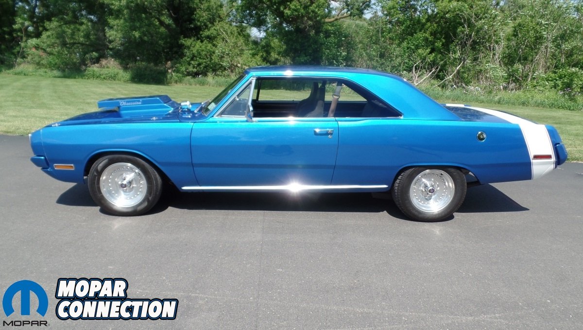 Under the hood, you’ll find the 340 out of Fred’s old ’69 Swinger. The engine has been bored .030 over, balanced and blue printed. It was fitted with KB hypereutectic pistons, a Mopar Performance Purple camshaft, Edelbrock Performer RPM heads, a Moroso lifter valley oil baffle, Hughes roller rockers, hardened shafts and billet hold downs. Up top sits a Holley Strip Dominator intake and a Bigs Performance Stage V 750cfm double pumper carburetor. Giving the Dart spark is done by an MSD ignition and Fred installed a NOS brand nitrous system for an extra boost of power. Everything breathes through a pair of TTI headers that feed into a full 3″ exhaust system with Hooker Max Flo mufflers.