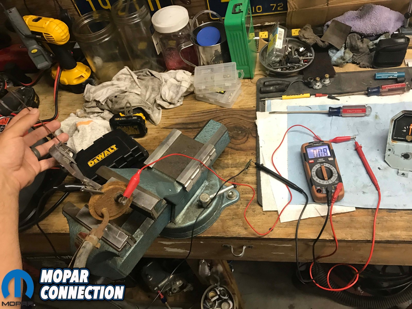 Our fuel gauge was pegged past the full mark which point to the rheostat not creating any Ohms. There could be multiple reasons for this scenario. Potentially the wire running from the gauge could be grounding out on the body and causing the rheostat to read 0 Ohms. The other scenario is the center terminal on the sending unit itself is grounding out on the body or something inside the sending unit is bad. The easiest way to check the sending unit is to disconnect it from the lead wire and turn the car on. If the gauge still reads full or past full, the wire between the sending unit and the gauge is grounded out and the sending unit might be OK. If it reads empty that means the wire between the gauge and sending unit should be OK and there’s in issue with the sending unit. When we disconnected the lead wire our gauge read empty, so we knew our lead wire from our gauge was fine and that something in the sending unit was bad.