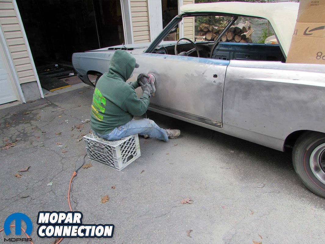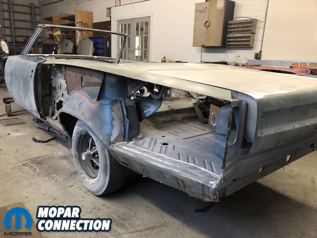 After weighing his options, it was decided that new AMD full quarter panels would be installed. Since AMD does not make convertible quarter panels, regular hardtop panels were purchased and modified to fit the convertible body perfectly. With the metal work completed, the GTX was primed and then painted a fresh coat of B7 Jamaica Blue.