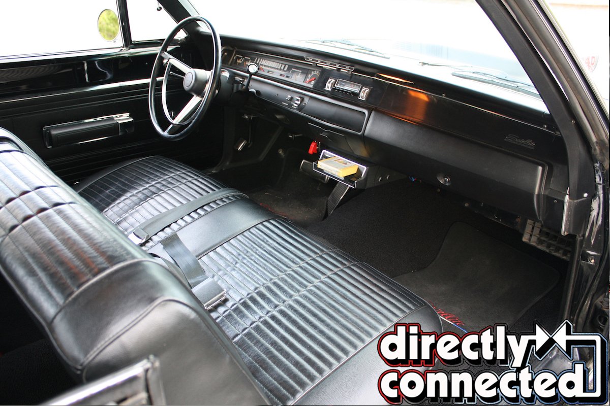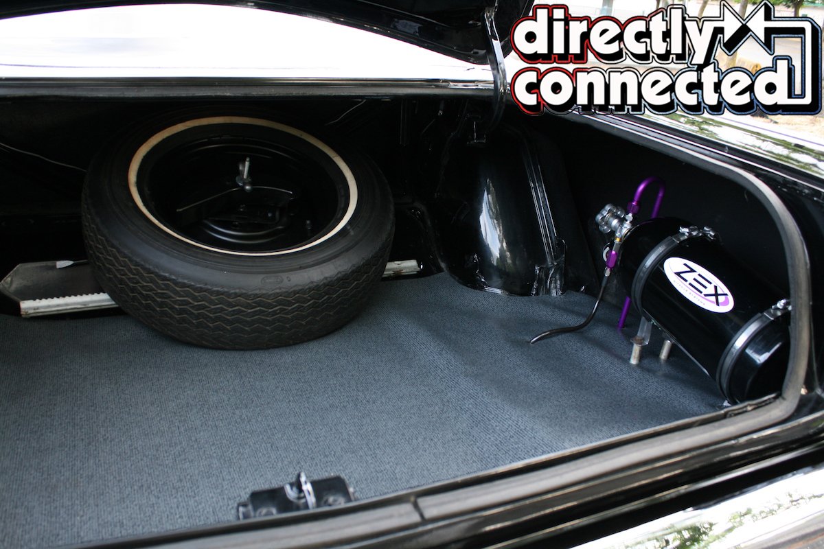 On the inside of the car, Mark decided to stay completely factory stock with it and the original gold interior was replaced with brand new black pieces. Added for good measure is a period-correct 8 track player. (We can confirm that Mark has a good sized collection of 8 track tapes that he plays in rotation!) The only other addition to the interior is the bright red nitrous switch mounted on the bottom of the dash.