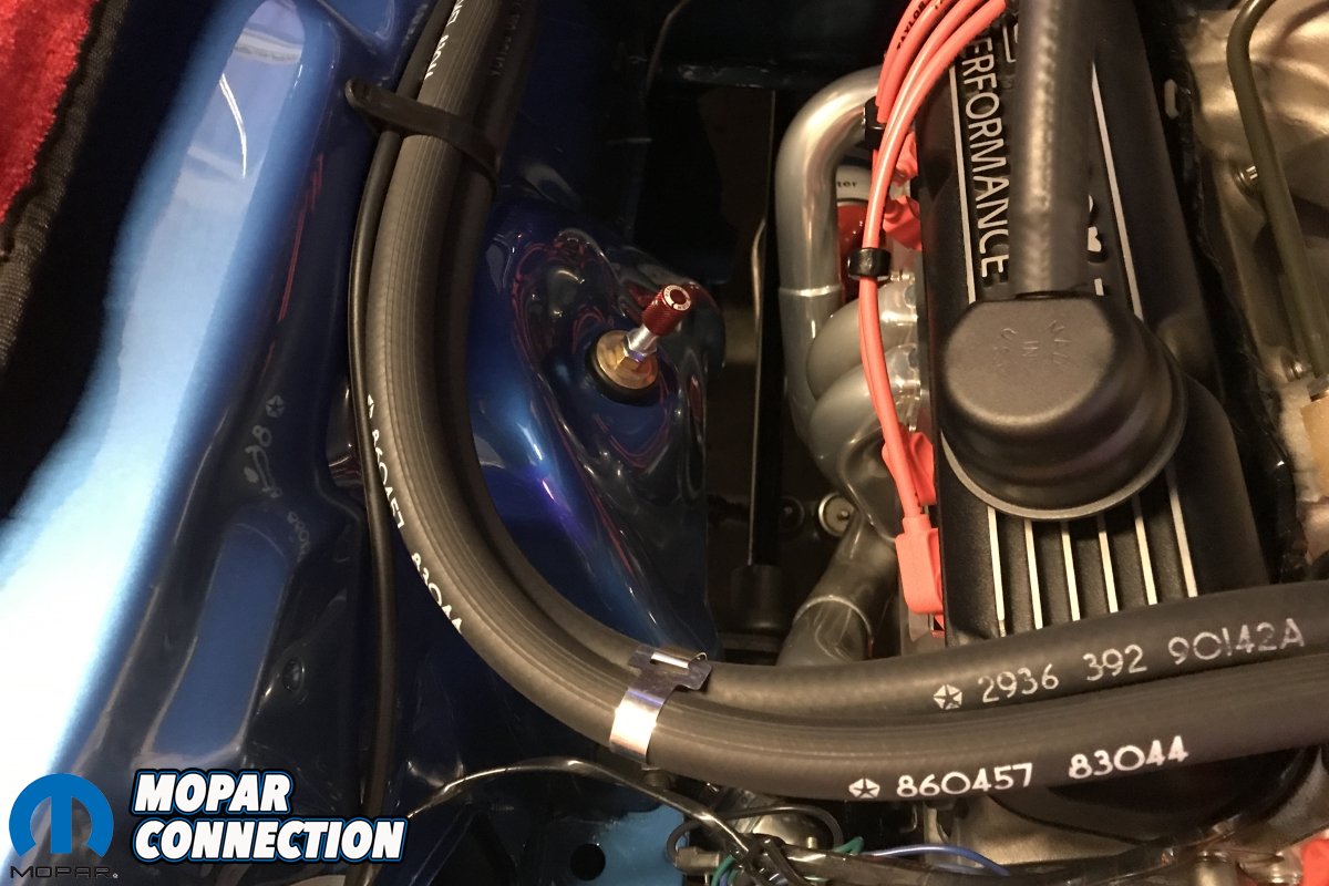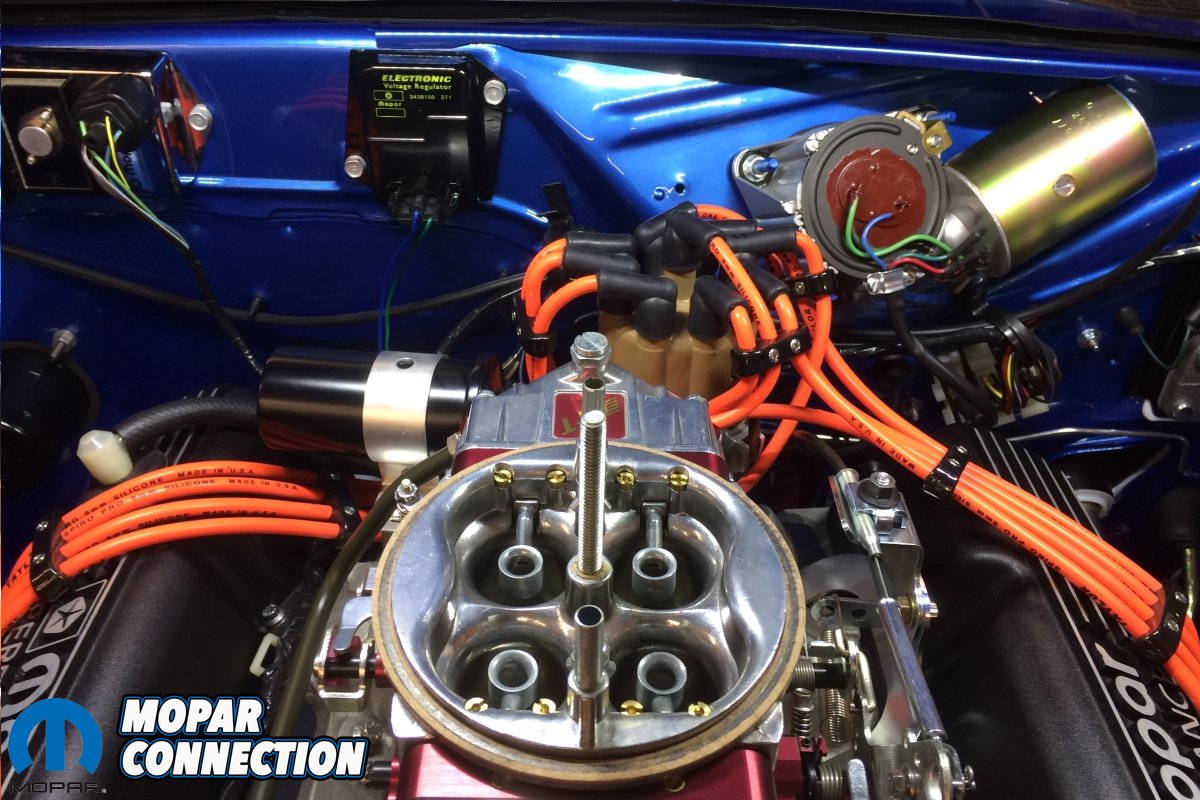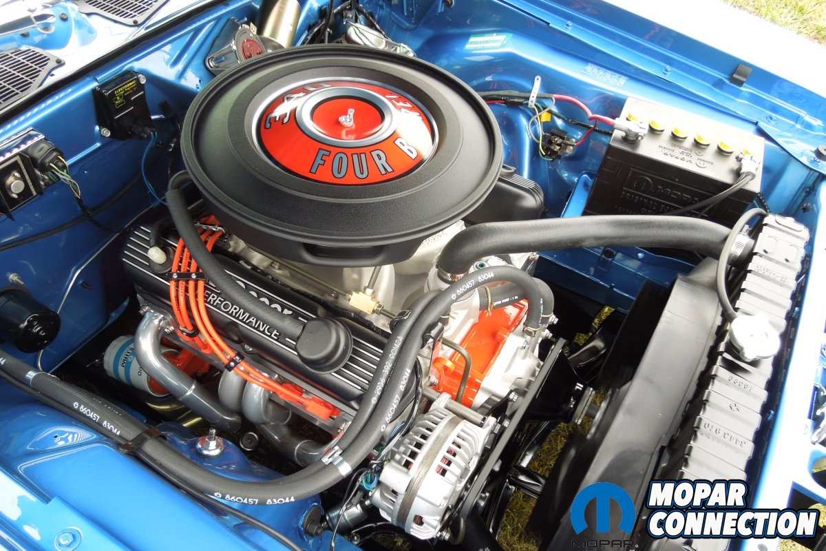 Under the hood is a non-original 1971 340 with 11.1 compression. It’s been fitted with a 507/494 COMP Cams hydraulic flat tappet camshaft with factory cast 273 rocker arms, Edelbrock RPM aluminum heads, Edelbrock RPM Air Gap intake, Quick Fuel Q750 mechanical secondary carburetor, Mopar Performance billet distributor and chrome ignition box finished off with Taylor plug wires. The 340 breathes through TTI headers and a full TTI exhaust system with Flowmaster Series 40 mufflers. According to Shane, the engine put out 351 RWHP but he currently has the heads and intake out for porting with the goal of achieving at least 400 RWHP. He also tells us that the original 340 is sitting on a shelf for safe keeping.