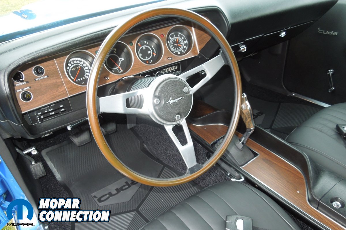 On the inside, the interior was completely restored with new parts. The seats were upgraded to the optional leather you could have gotten in 1971 and the steering wheel was upgraded to the optional Rim Blow. The tach and clock were sent off to Redline Gauges for modern electronic upgrades and the ‘Cuda features complete new wiring harnesses throughout. To keep the noise manageable inside, Dynomat was used throughout the interior. Shane tells us that everything else was replaced with the way the car came; the only other exception being the factory cassette player.