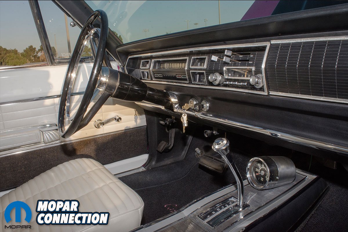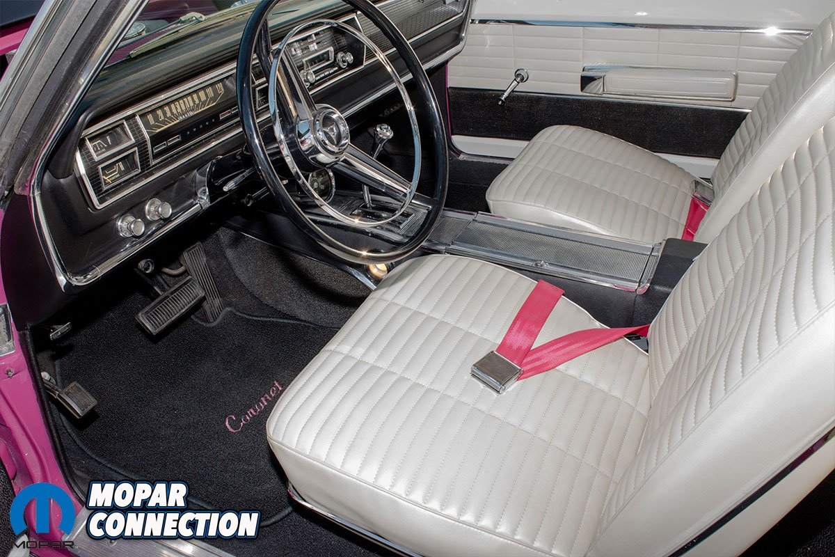 The interior is correct for the 1966 Dodge Coronet, with the exception of matching Panther Pink seat belts, and floor mats with the name of the car, embroidered in the center. The center console is the classic metal console, found on all B Body Mopars. Sprague kept the original steering wheel and dashboard, as a classic touch to this ’66 Dodge. The headliner is correct to what was in the car originally, with working interior lights. Also present is the tachometer, located underneath the dash, atop the center console.
