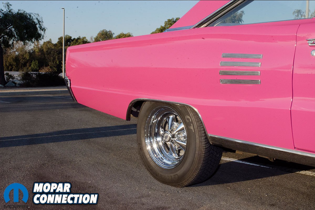 This 1966 Dodge Coronet is a resto-mod, meaning it’s been customized, but restored with aftermarket parts. Starting off with the Panther Pink paint, which replaced the original green that was on the car when it was new. The wheels were replaced with the classic Cragar wheels, found on muscle cars, hot rods, and drag cars. Tires are modern-day Grand Am radials, which are common for most classic cars that are not restored to concours quality.