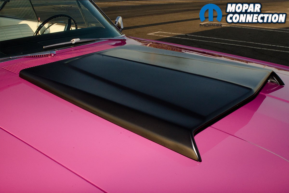 Headlights were replaced with modern items. The door lock buttons were topped with figurines of the famous Rat Fink, made famous by Ed “Big Daddy” Roth, along with the rivets on the license plate frames, which are also topped with the logo from Mooneyes. Additionally, a Coronet “Hemi Hood” scoop was added to the car.