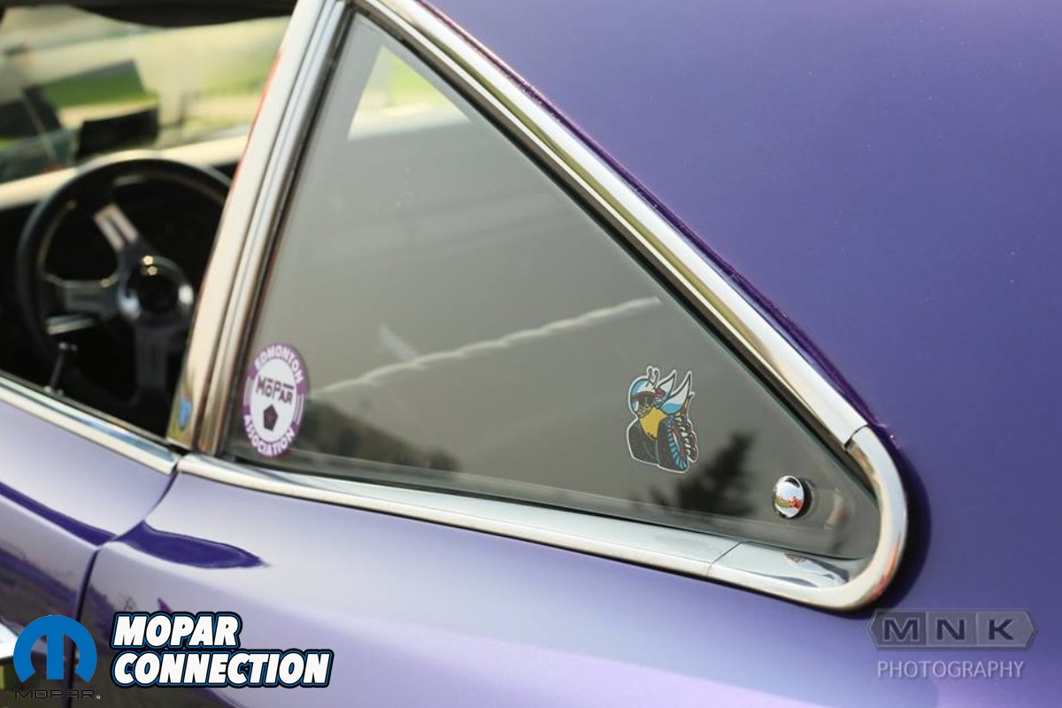 With the help of his family and friends, Ed worked day and night to finish the car for a Father’s Day car show in near-by Hinton. He says, “During this time re-assembling the car, I decided I didn’t like the original steel hood so I sold it. I searched and eventually found a fiberglass A12 Six Pack lift off hood down in southern Alberta. However, when I put it on the car, I realized the matte black finish on the hood looked off with the Purple paint and White stripe. My wife suggested I paint the hood White to match the stripe so I did and the rest is history!”