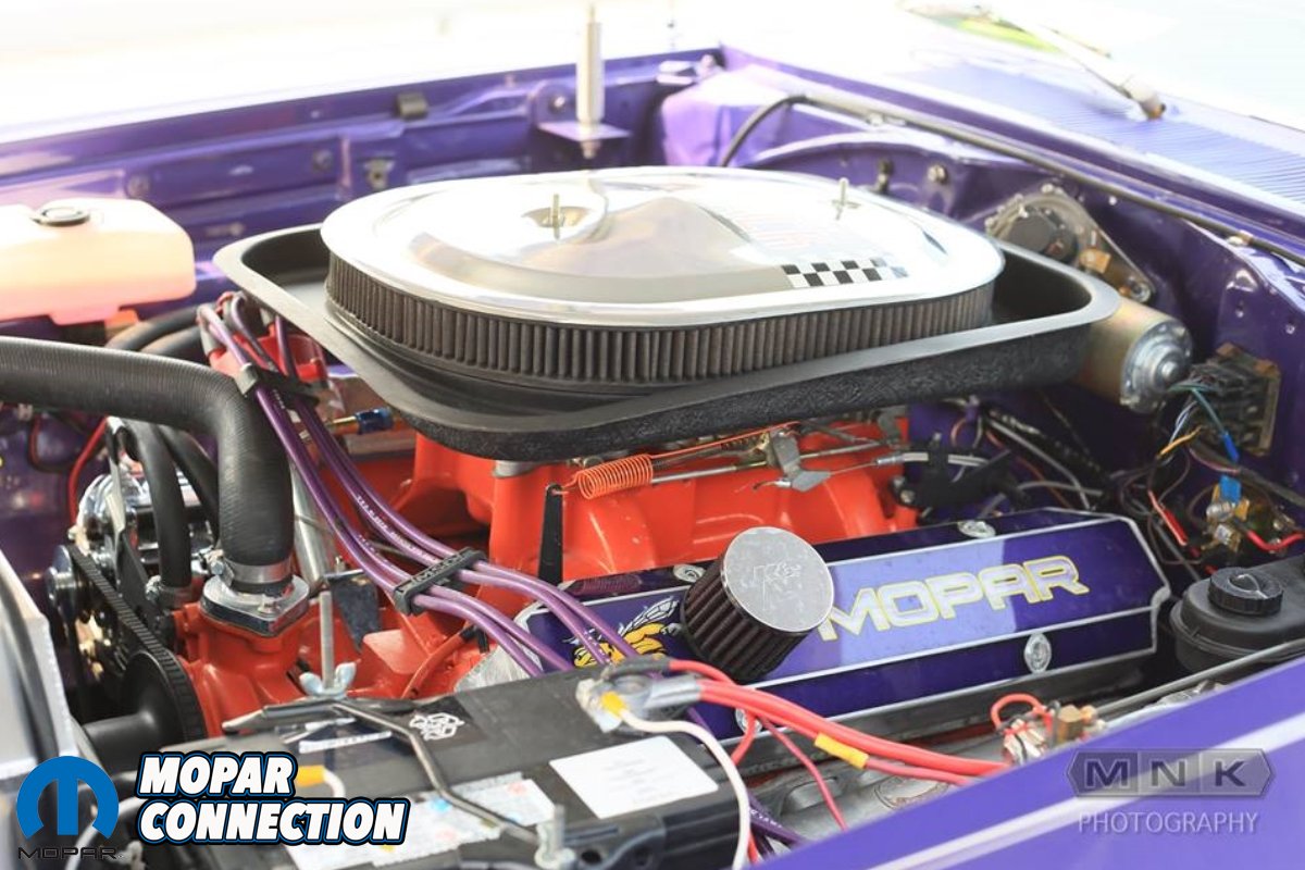 The 440 was pulled and replaced with a 493 stroker built by Darcy Clarke at Red Door Racing. The new stroker engine is based off a 440 block and features 440 Source cylinder heads, a Molnar stroker crank, Molnar rods and Harland Sharp rockers. Up top, the Six Pack set-up was re-installed. Everything breathes through Hooker headers that run into a full 2.5″ exhaust system with Flowmaster mufflers.