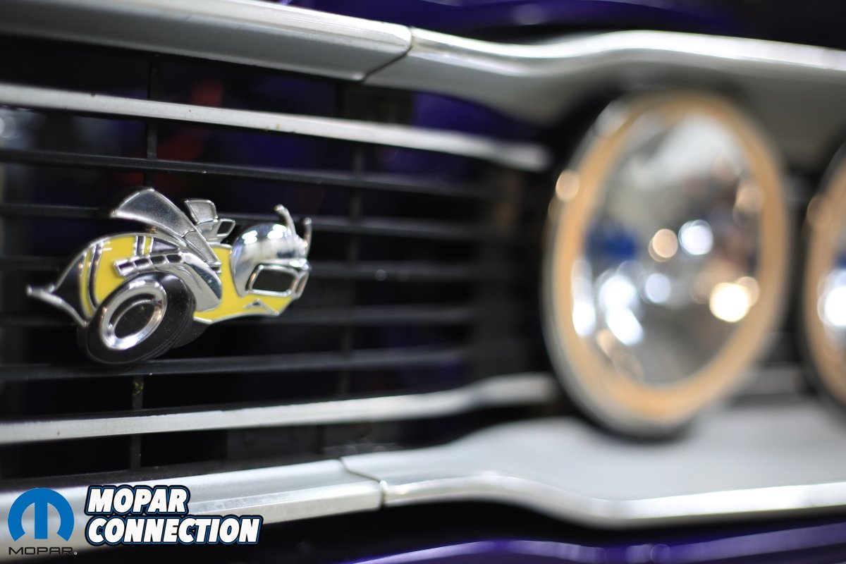 As it turns out, the car needed new floors, quarter panels and a driver’s front fender. While Auto Metal Direct came to the rescue with their reproduction sheet metal, Mike had to build a good front fender out of a couple different donor fenders. Once the sheet metal and body work were complete, it was time to pick a paint color. While he knew he wanted to keep the car Purple, Ed wanted to put a twist on it. It was decided to paint the car in a more modern Plum Crazy Pearl Coat to get that ultimate metallic sparkle. To contrast the Purple paint, a White bumblebee stripe was installed across the rear of the car.