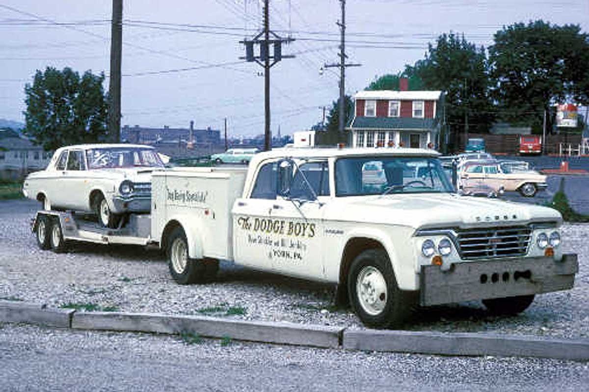 Above Left: Jenkins’ involvement with Mopar started in 1964 due to Chevrolet ending its race program at the end of 1963. Jenkins built the engines for Dave Strickler. The two were known as “the Dodge Boys.” Above Right: Strickler got a corporate sponsorship with Dodge. He purchased the Dodge race car from Chrysler for a dollar. The tow truck and trailer were pretty advanced for 1964.