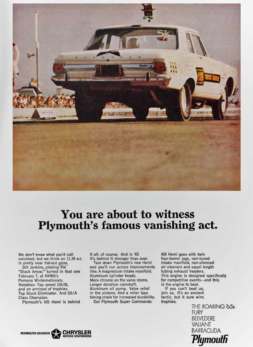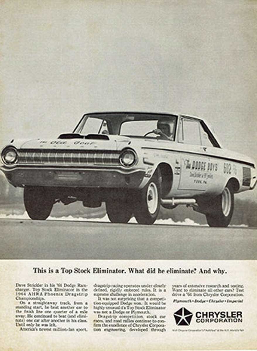 Above: The Chrysler Corporation took out several single-page ads in magazines during the 1960s representing the heroics of its racing teams. Jenkins built the 426 Max Wedges for Dave Strickler, and he added driving duties to his resume with the Black Arrow Plymouth.