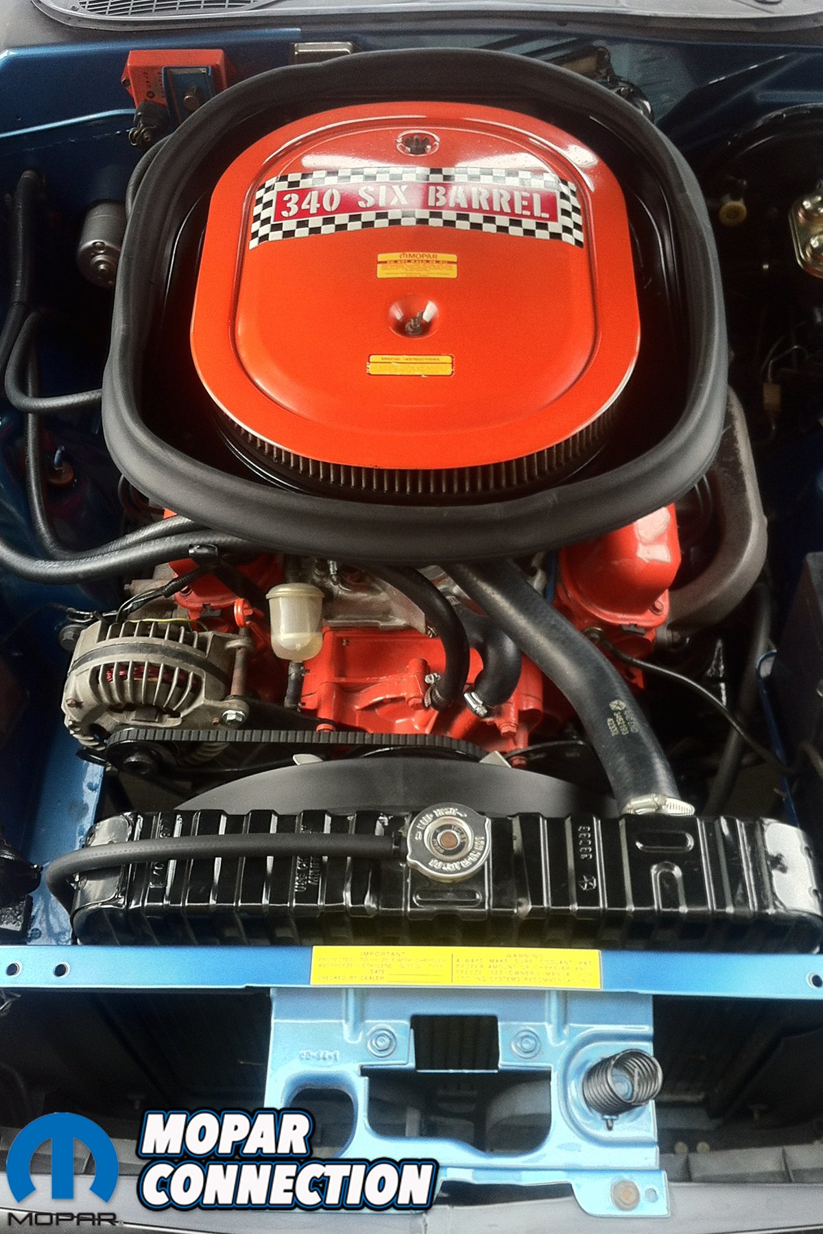 Originally a run-of-the-mill 318 car, the previous owner had painted it B5 Blue during the restoration and turned it into an AAR replica with the stripes, hood and spoilers along with a set of 15-inch Rallye wheels. The 340 sitting between the fenders is a 1969 block featuring “O” heads with 2.02″/1.60″ valves, stock crank and a warmed-over cam. The previous owner added an Edelbrock six-barrel manifold with three Holley carbs to go with the AAR theme. Once Dan got the ‘Cuda home, he decided to make some changes to it.