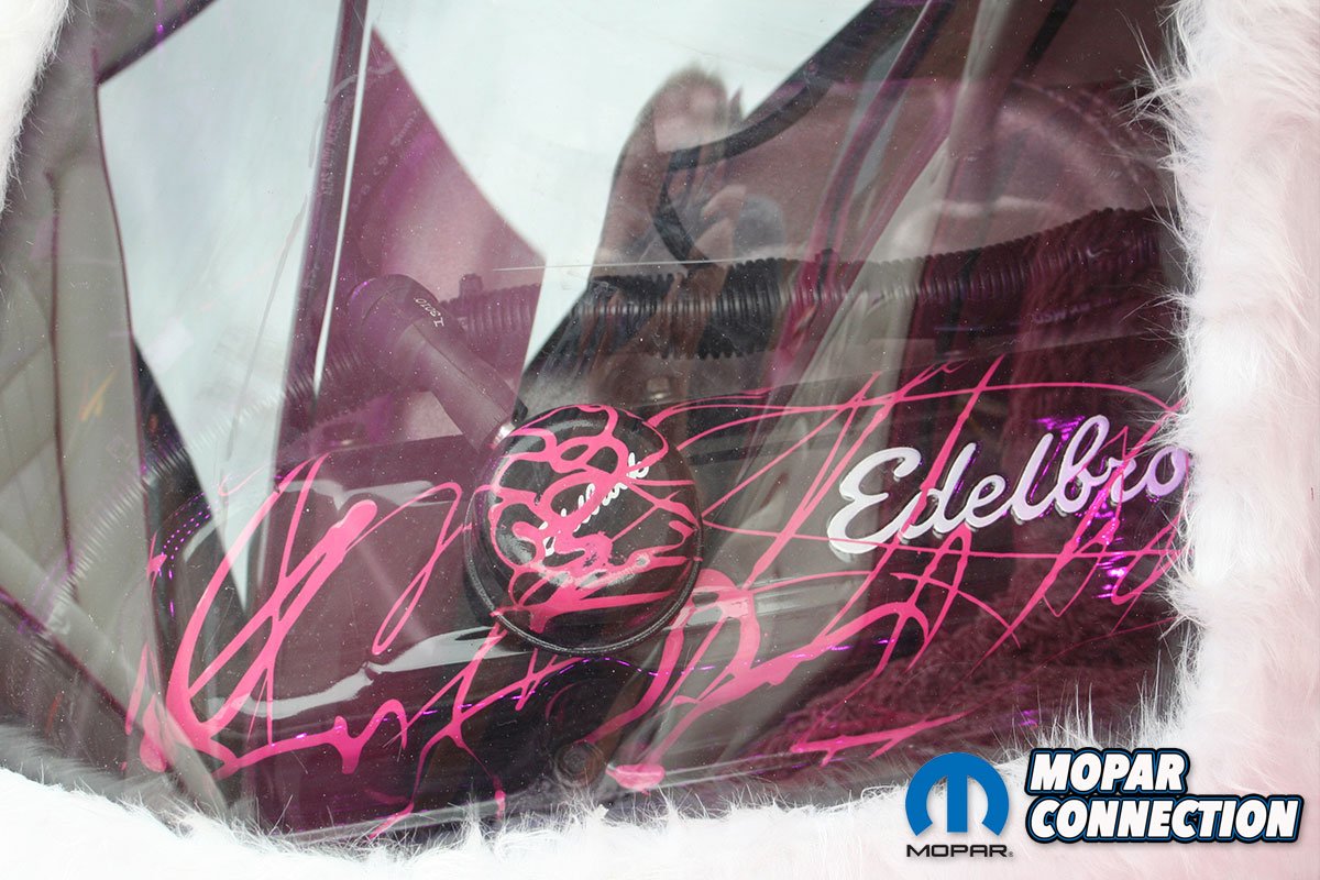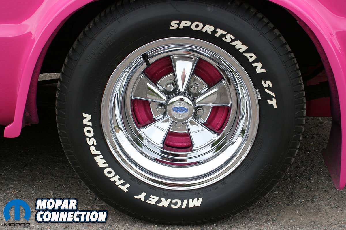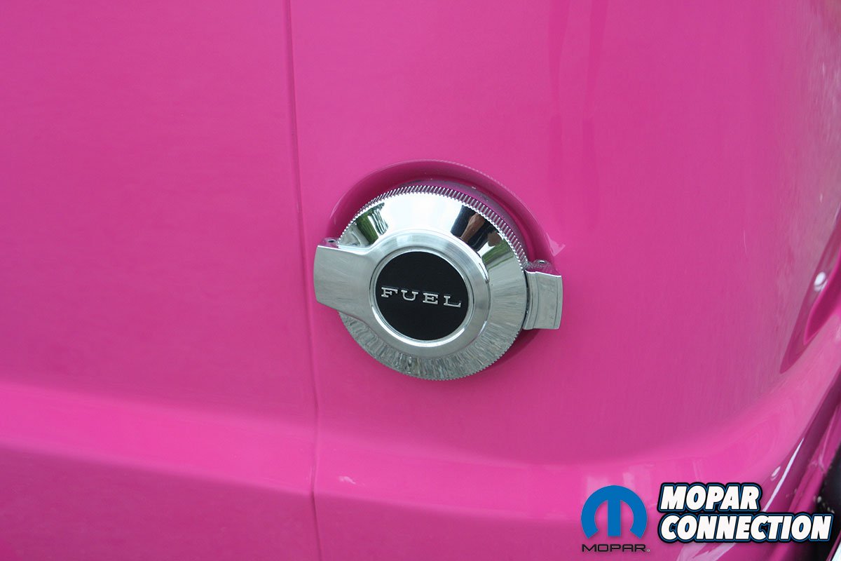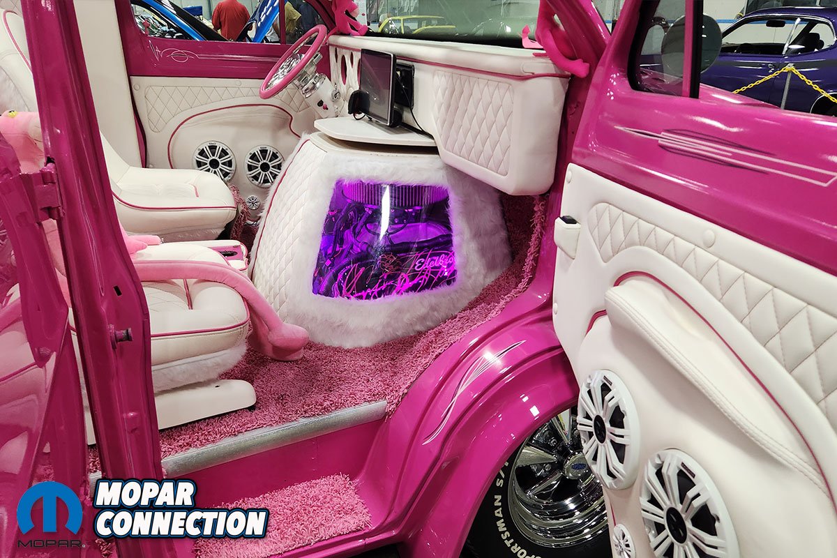 Under the hood, the worn-out 318 engine was swapped out for a 440. Ken rebuilt the engine himself, which has been upgraded with a FiTech EFI, an Edelbrock aluminum intake manifold and Hooker headers that flow into Patriot chrome side pipes. Visible through the doghouse’s custom transparent windows, the engine showcases Edelbrock valve covers that have been refinished with a radical paint job. Under the hood lies a Pink Panther lunch box, which, upon honking the horn, plays the theme of the Pink Panther.
