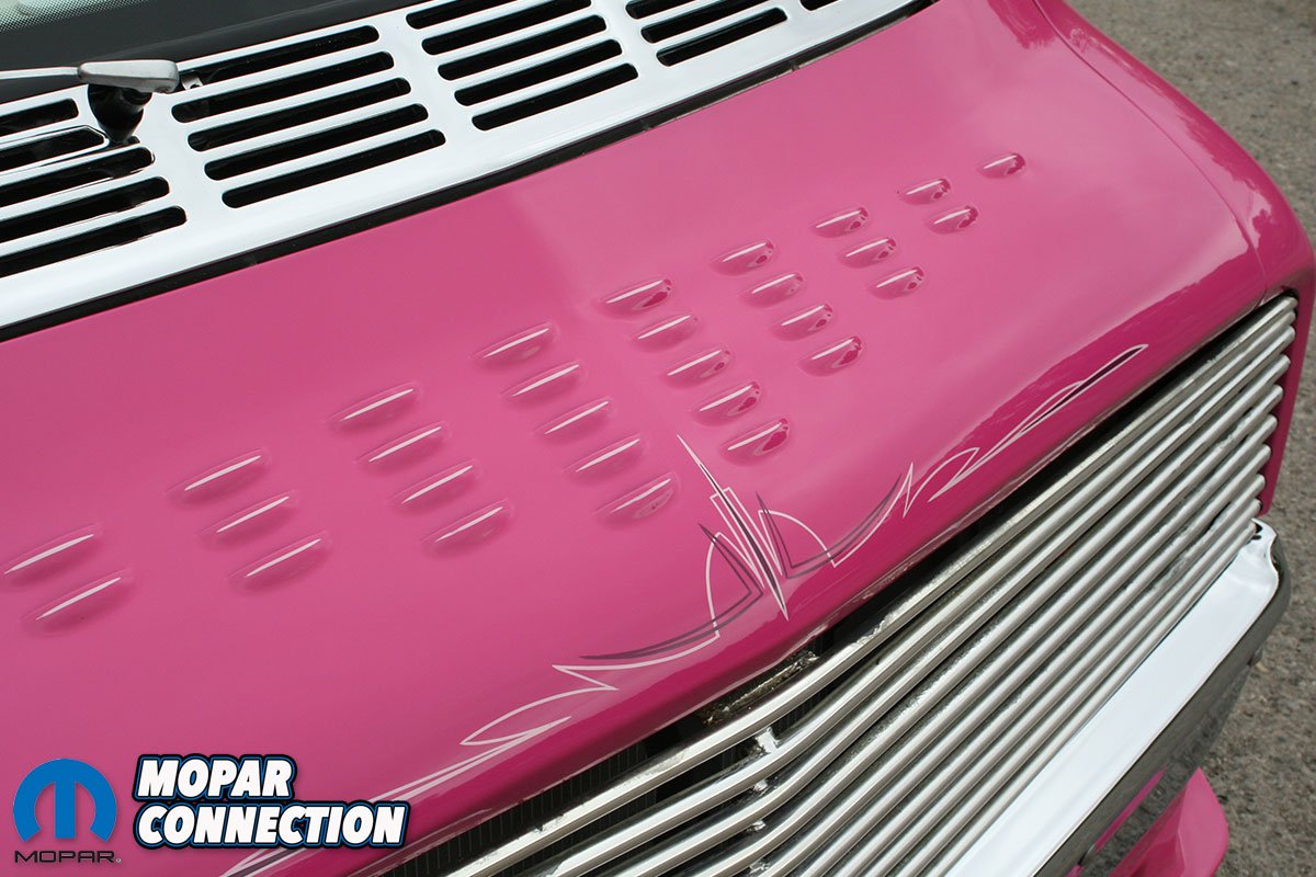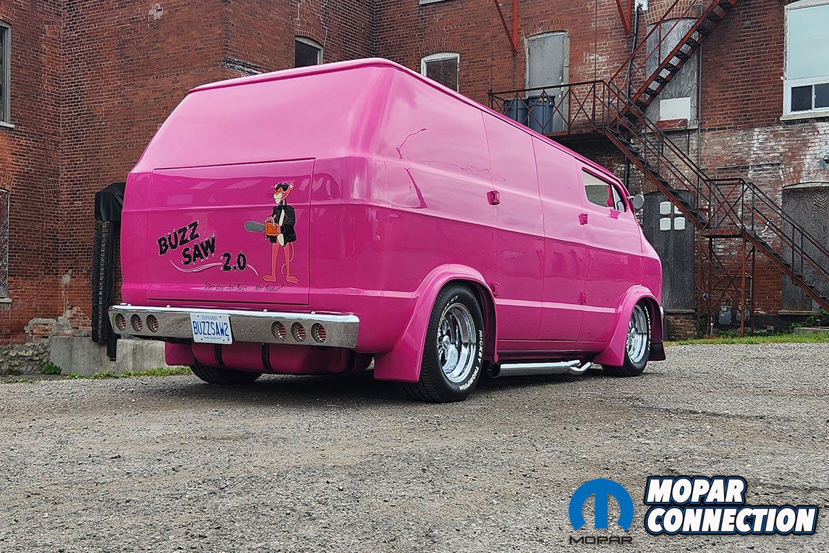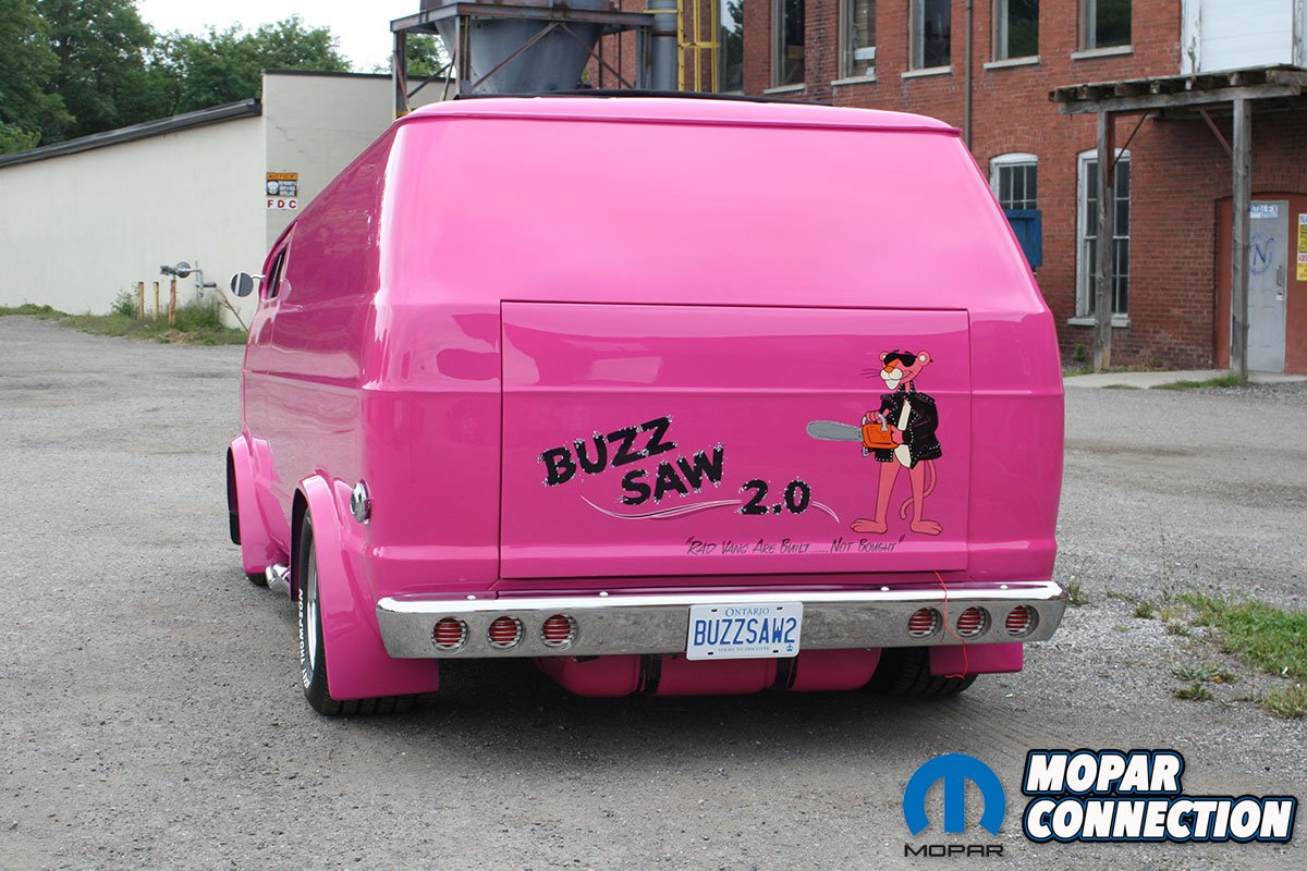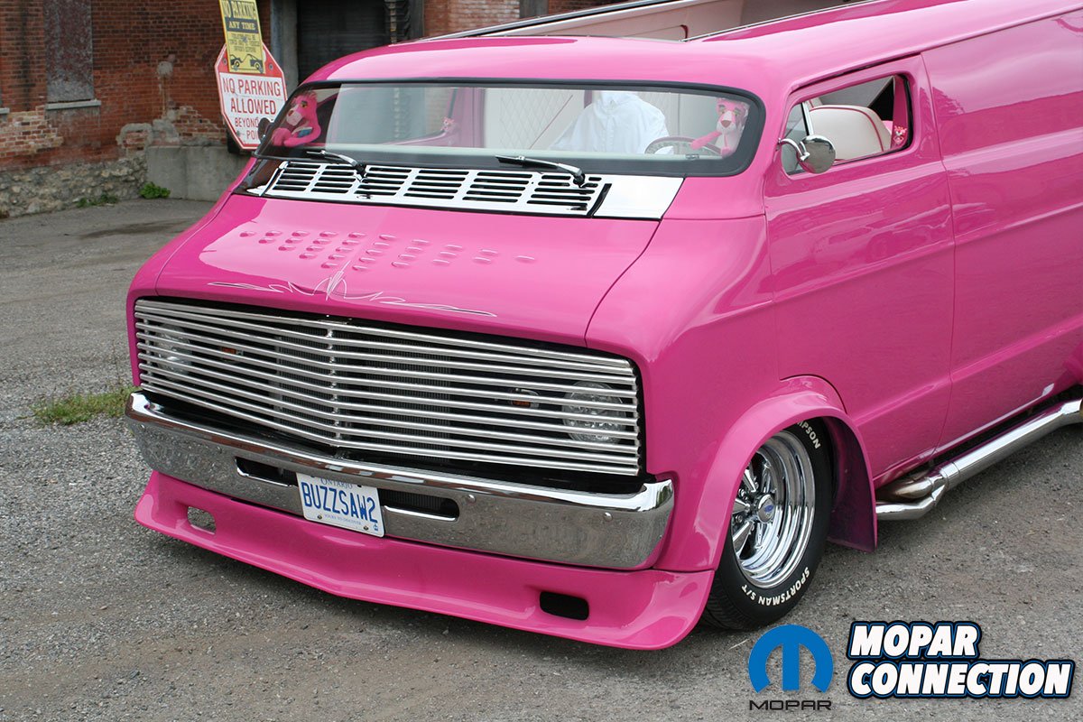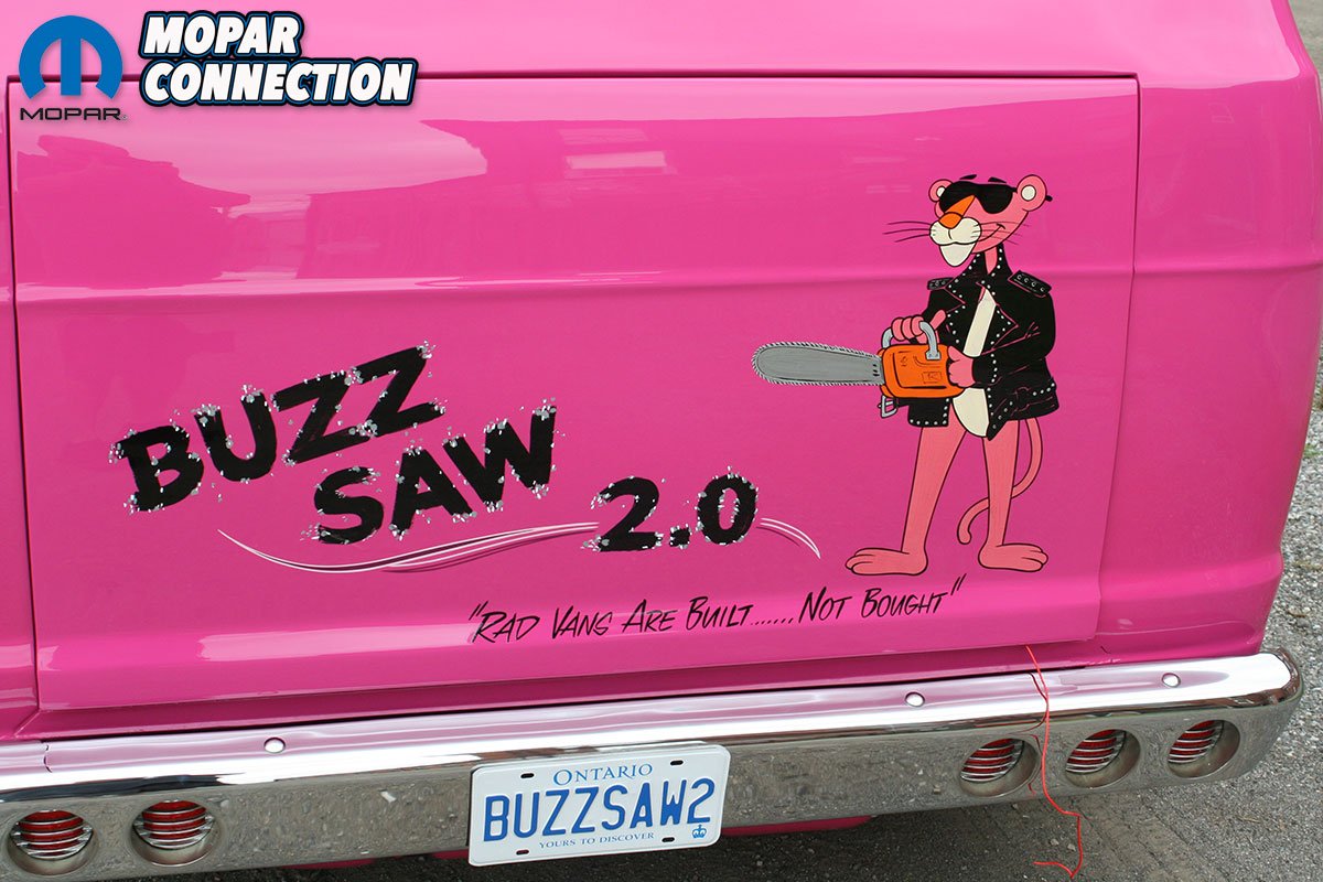 The color itself tells its own story. Ken, a Mopar enthusiast, chose not to use Chrysler’s FM3 Panther Pink. Instead, he searched the internet and found fluorescent house paint, which he brought to the body shop for matching. The resulting color was dubbed ‘Revving Pink.’ The van was treated to four layers of this pink and eight layers of clear coat, wet sanded between each layer, with a final buffing and polishing. The finishing touch was Rollie Guertin’s recreation of the ‘Buzz Saw’ lettering, featuring the Pink Panther with a chainsaw.