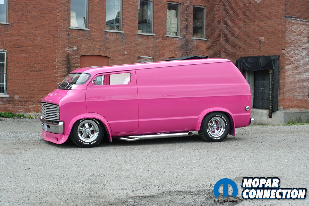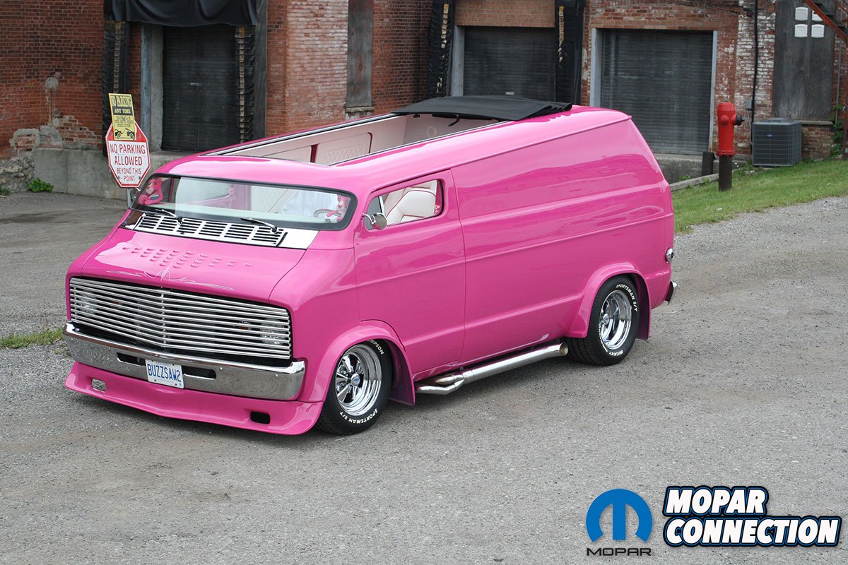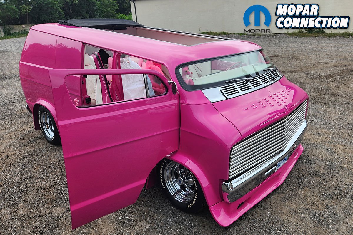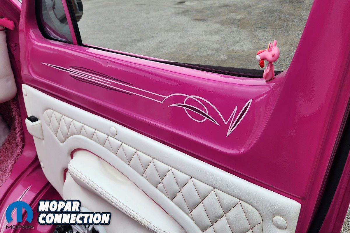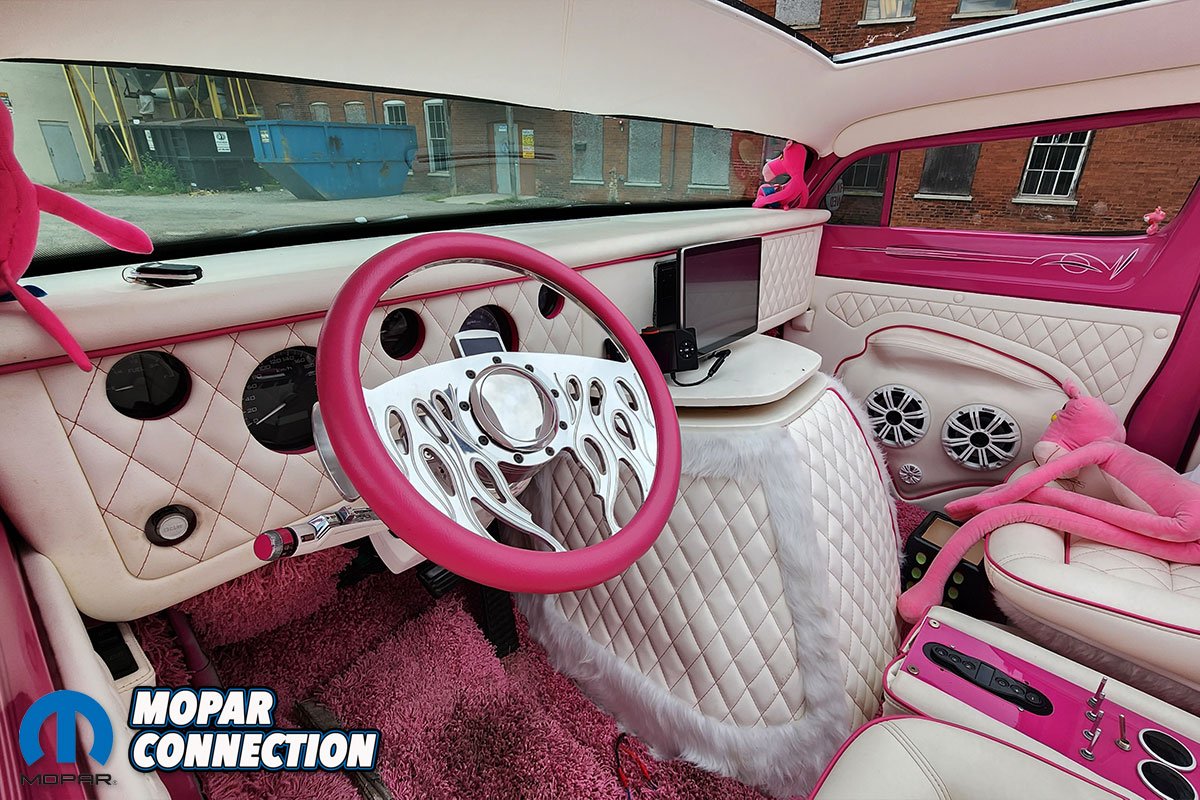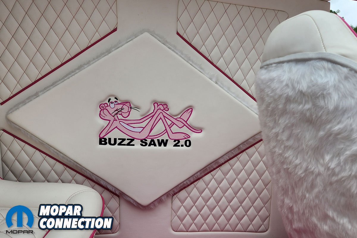 The color itself tells its own story. Ken, a Mopar enthusiast, chose not to use Chrysler’s FM3 Panther Pink. Instead, he searched the internet and found fluorescent house paint, which he brought to the body shop for matching. The resulting color was dubbed ‘Revving Pink.’ The van was treated to four layers of this pink and eight layers of clear coat, wet sanded between each layer, with a final buffing and polishing. The finishing touch was Rollie Guertin’s recreation of the ‘Buzz Saw’ lettering, featuring the Pink Panther with a chainsaw.