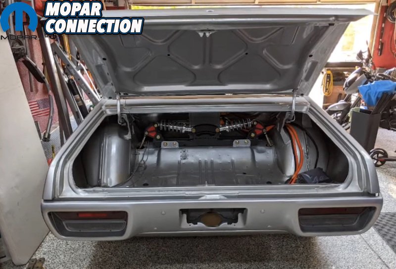 The original 318 engine, 904 transmission, and 8.25” rear end were stripped to make way for the Tesla drive unit out back and Gerst coil-over suspension up front. For the uninitiated, Tesla’s rear drive units are designed much like that of a late-model rear-wheel drive Challenger or Charger.