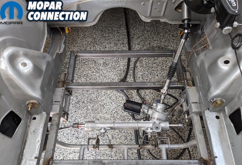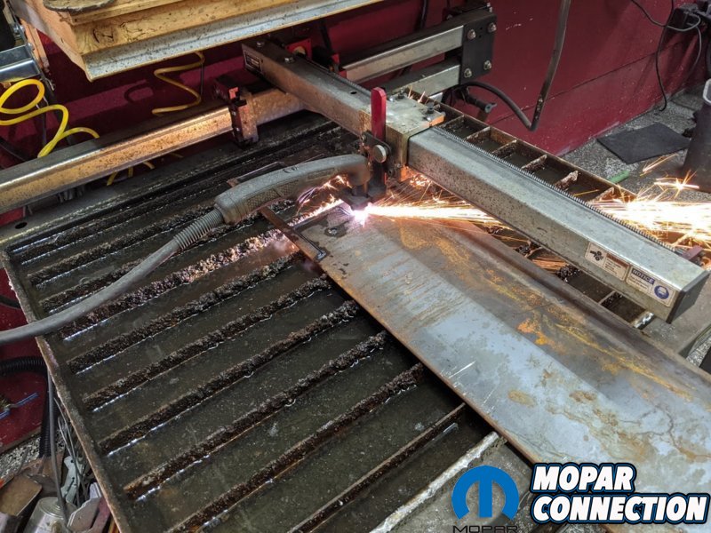 The compact packaging of the Tesla unit is really what made the swap feasible and, once Kevin started fitting it within the frame, the mating looked like a match made in Mopar heaven. Clearance notches were cut in the framerails to make room for the rear sway bar and upper control arms. With everything loosely positioned, Kevin drew up some custom 3/16” mounting brackets in Fusion 360 before cutting them on his Langmuir Systems Crossfire CNC plasma table. Squaring the cradle via the front leaf spring mounts helped position bracketry for final fitment.