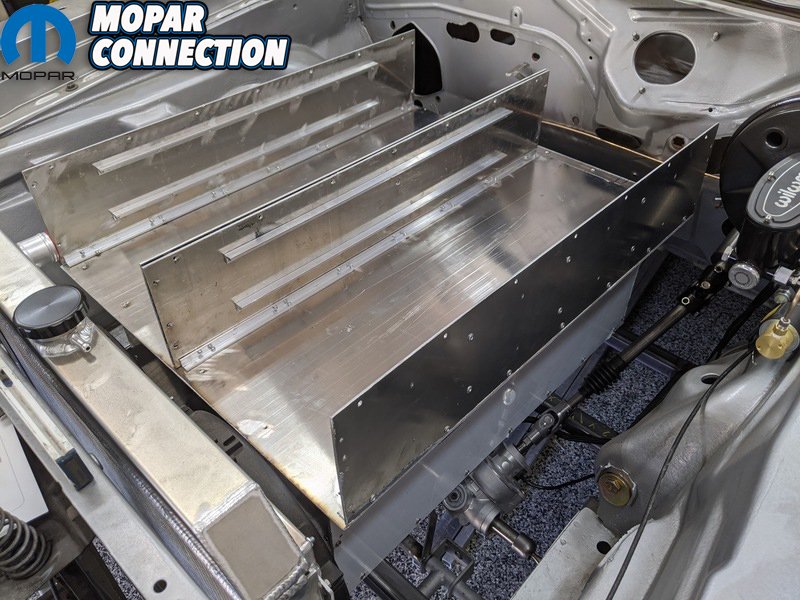 With all that amperage pulsing through miles of wiring, the coolant system required a complete redesign to keep heat at bay. Radiator modifications included removing the transmission cooler and adding an offset partition to the tanks. “The motor will use the smaller side, the batteries use the bigger side, and I’ve got threaded inputs and outputs that will feed the pumps,” says Kevin. The fan shroud was also modified so both fans could be mounted on the lower half of the radiator for battery box clearance.