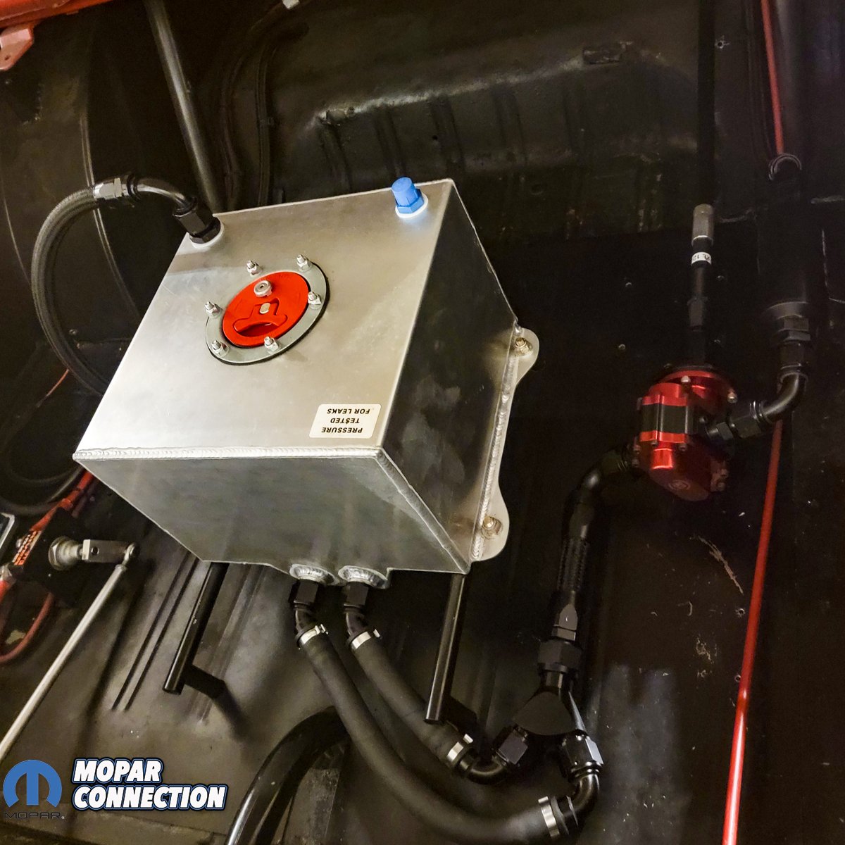 The width of the engine and front sump pan can be an issue for this type of retrofit but given the 65’s coil-over conversion with tubular front chassis, K-frame kit and drag pak style rear sump pan, Chris had zero fitment issues. Overcoming challenges in maintaining the fuel volume of methanol required at this power level and consistent oil pressure on 2.5g launches led Chris to implementing a Peterson external oil pump fed from the Drag Pak pan rear sump, and a cable drive extending to the mechanical Waterman pump in the trunk.