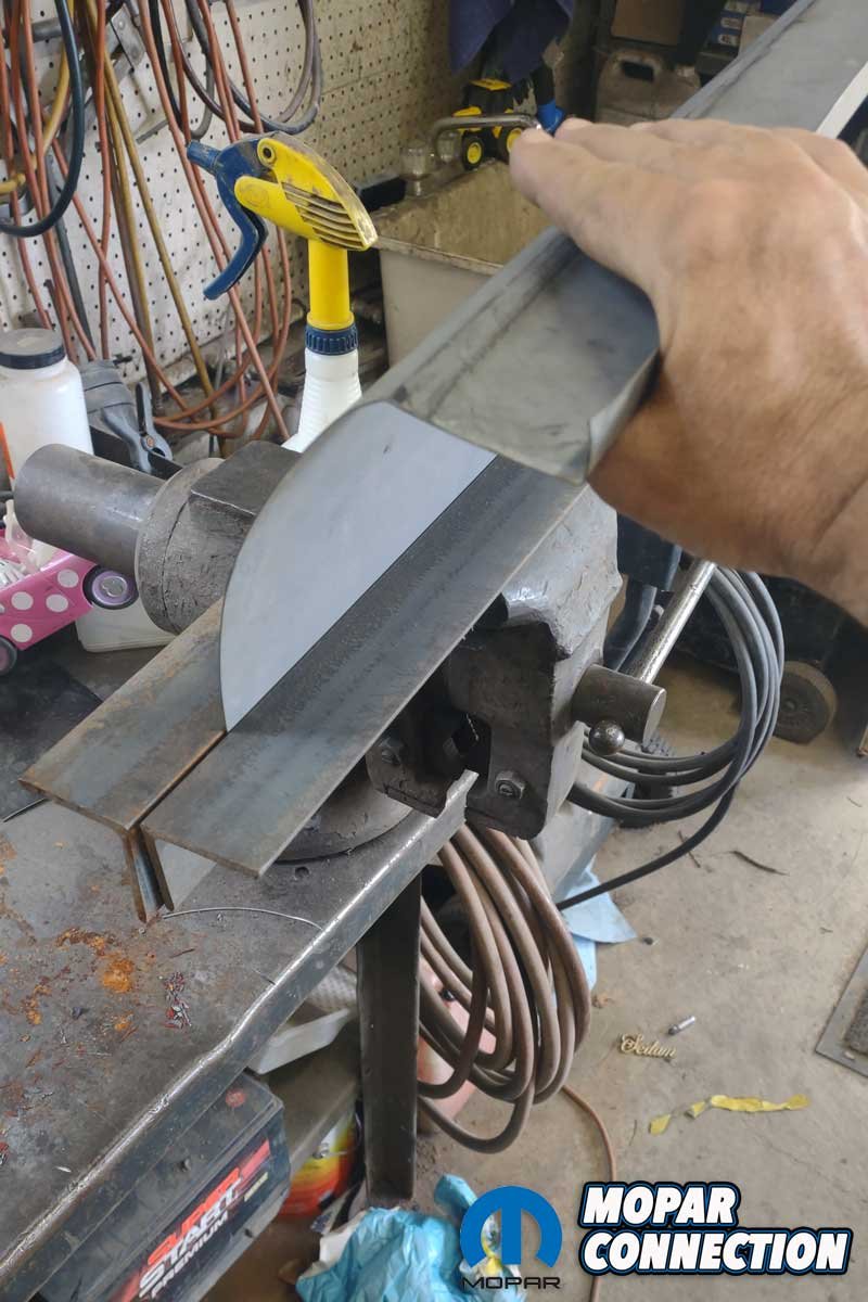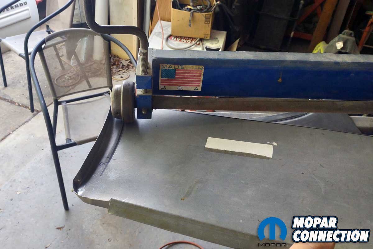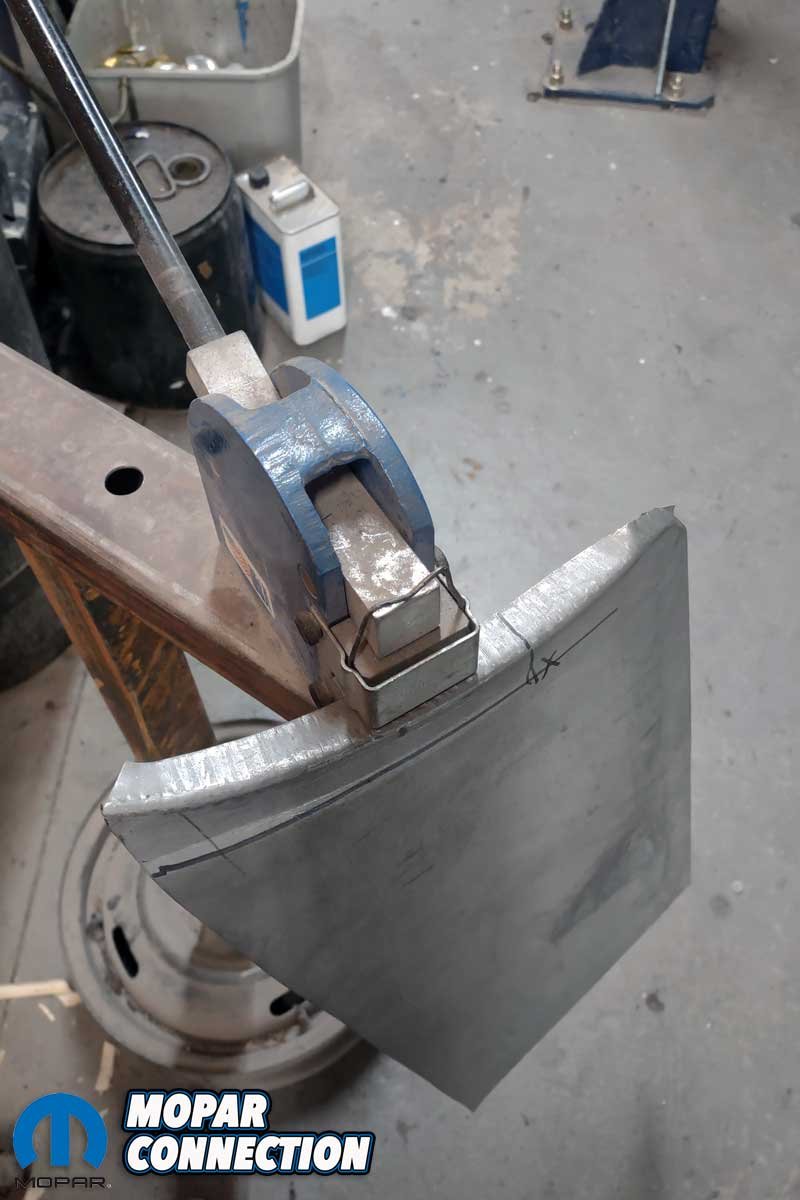 The new panel still did not match the curvature of the factory outer wheel well, so two more techniques were employed to make the correct curve. First, Chamberlain used a shrinker/stretcher tool to, in this case, shrink the metal at the lip to meet the contour of the opening. Next, using two pieces of 3/16-inch angle iron mounted in a bench vice, the panel was clamped and gently pulled until the desired arc of the panel was realized.