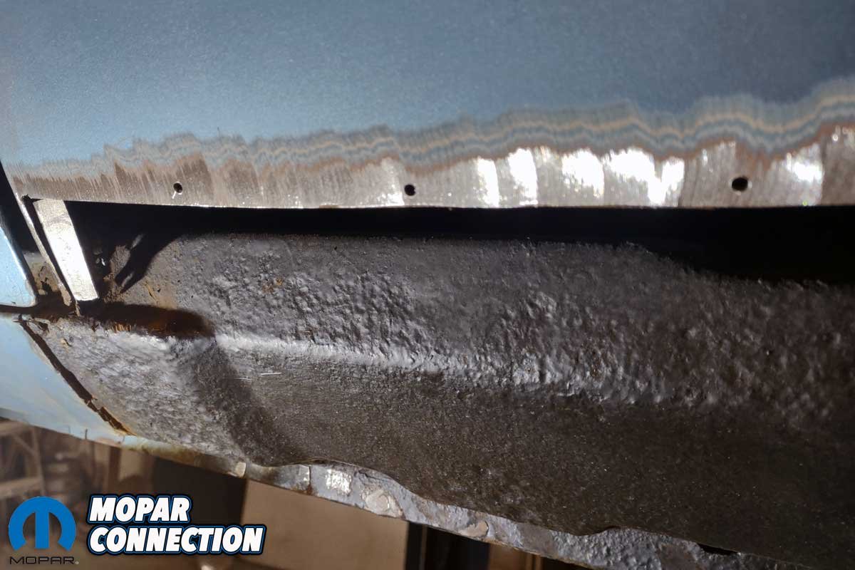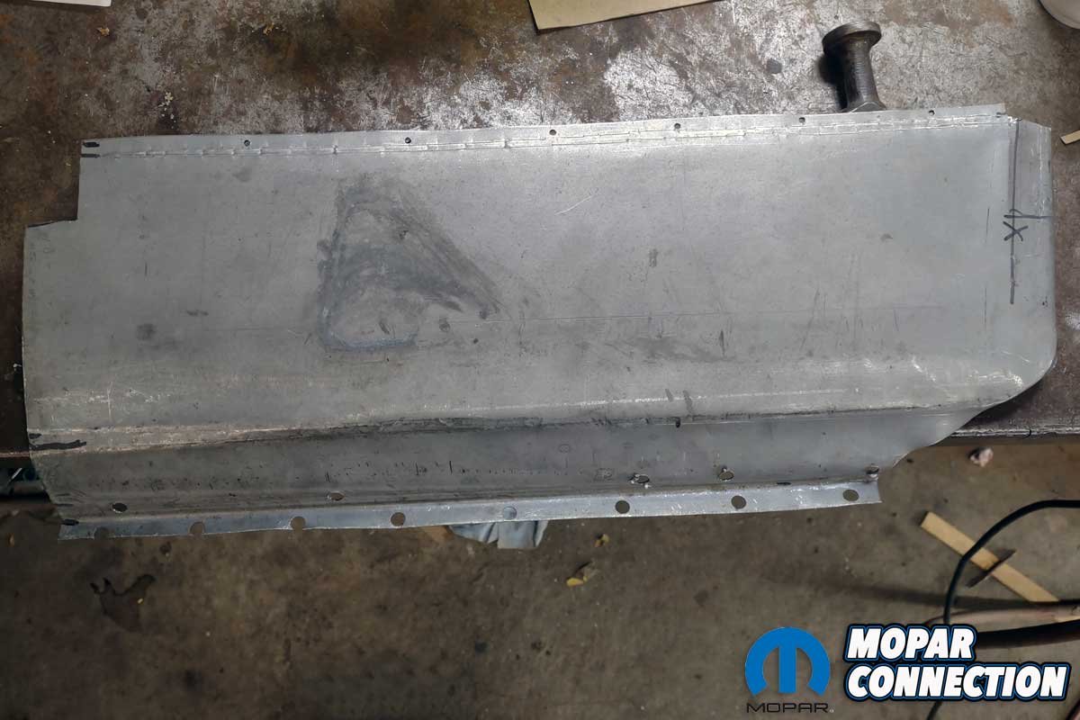 At the front edge of the panel near the door opening, Chamberlain added extra metal. Again, a butt weld secured the metal but allowed the original panel to remain in the door opening. The lower section of the patch panel was laid over the original inner rocker panel, and it matched so well that it only needed holes punched through the lower edge at the pinch weld for plug welds.