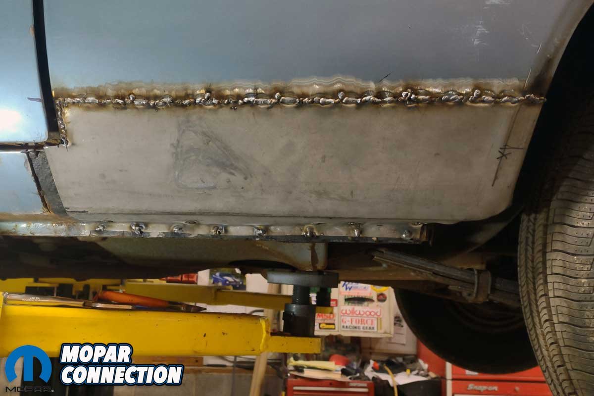 Above Left: A 1-inch steel section joined the repair panel to the factory rocker panel. Above Right: The welds on the strip were sanded smooth to observe the fit into the rocker panel.
