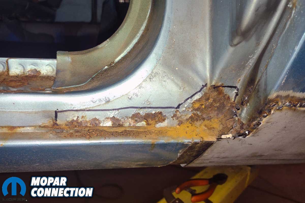 Above Left: The bottom corner of the door opening at the base of the B-pillar had rust concerns. Chamberlain marked the damaged area with a Sharpie. Above Right: The rust was cut from Marsha’s chassis. The remaining steel was treated with a rust inhibitor.