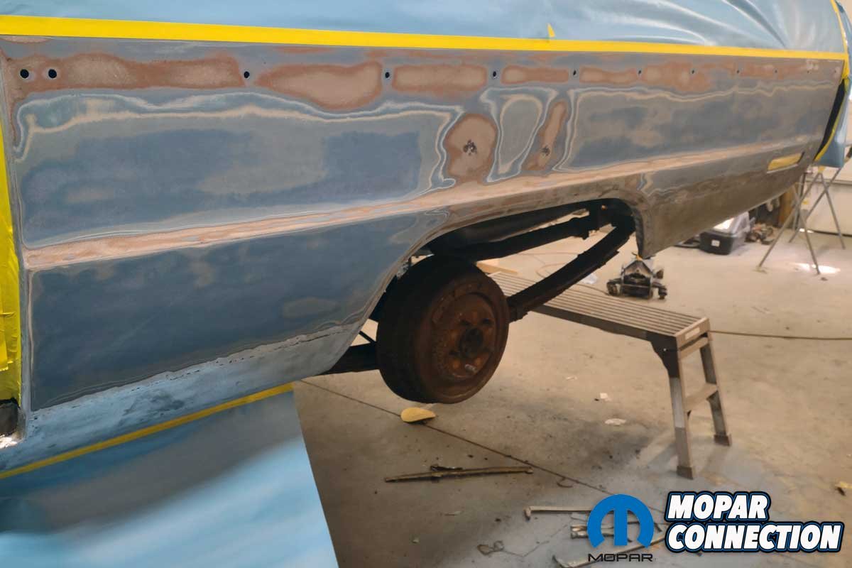 Once all the new metal was welded, it was smoothed down with a grinder. To prepare the area for primer, Chamberlain used a dual-action (DA) sander with 80-grit paper to remove several layers of paint. The entire quarter below the trim metal was sprayed with two coats of epoxy primer. The epoxy primer sealed the bare metal while the next steps were planned.