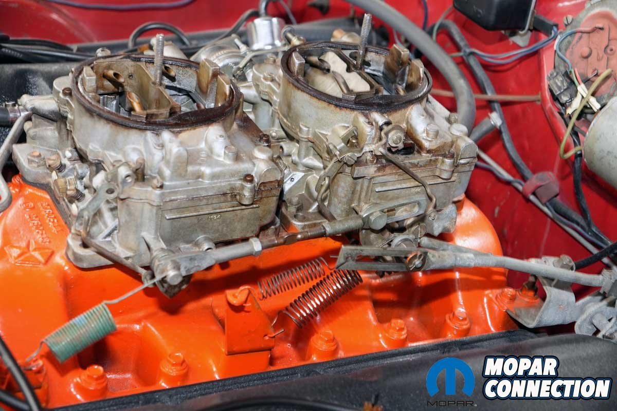 Above Left: The Hemi is stock and retains most of its original parts. It appears the driver’s side fender apron was subjected to a battery acid spill, but the factory fender tag is in place. The tag, the radiator support, and the trunk opening lip all have the same serial number – it is an actual Hemi car. Above Right: The AFBs need some cleaning and adjustments, but they are complete. The rear carburetor is the correct unit for 1968. However, the front carburetor is from 1966. All the springs, linkages, and kick-down linkage are original and accurate.