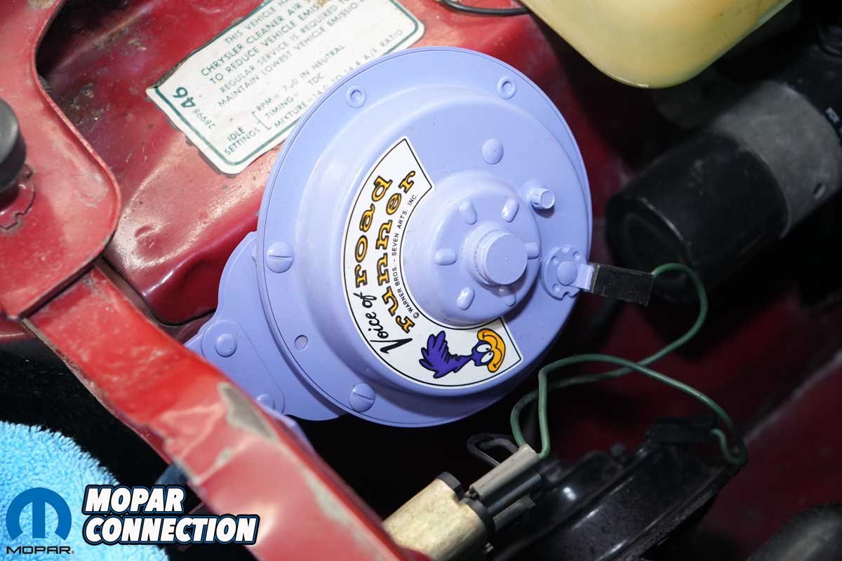 Above Left: The vinyl top and chrome around the windows are all the original pieces installed on the Road Runner in June 1968. Above Right: According to published data, the purple “beep, beep” horn was unavailable for the 1968 models. However, there are claims that reveal some late ’68 models got one. Also, data states that only one horn was standard, but the factory wiring schematics show two, and the wiring on the Road Runner has provisions for two horns. The purple and black horns take care of the beep, beep, which is the sound associated with a Road Runner. Plymouth paid $10,000 to develop the correct sound.