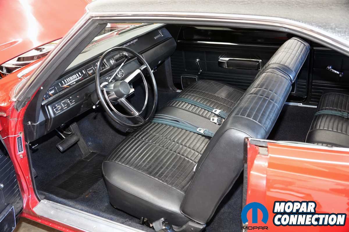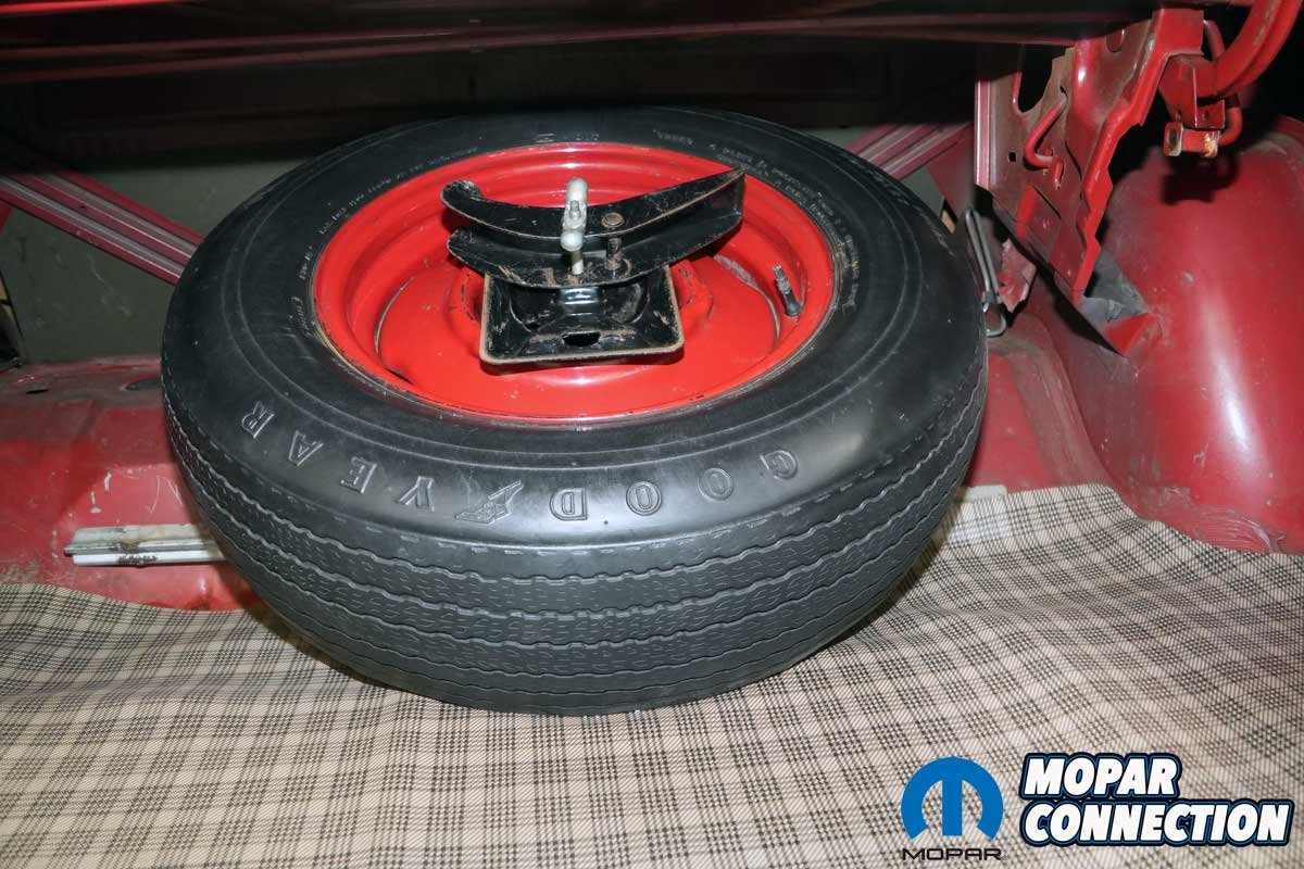 Above Left: The Road Runner came with the basic poverty caps and body-colored wheels. The original tires were red striped bias-ply tires. Now, it rides are radial red stripe BF Goodrich tires. Due to their age, the tires will be replaced prior to getting the Road Runner on the road. Above Right: The interior of the Road Runner is spartan, like a taxi cab. The instrumentation is basic with engine temperature, ammeter, and fuel gauges. The ‘Runner was ordered with a clock, which unfortunately has not worked for decades.