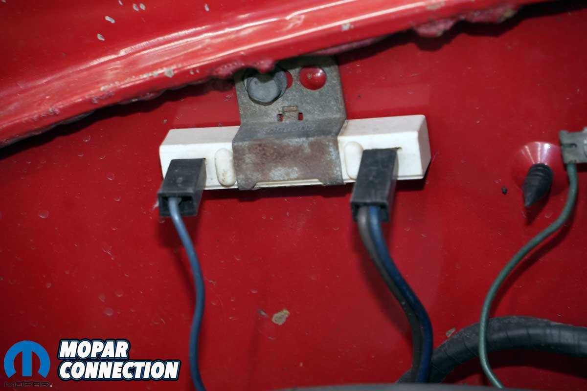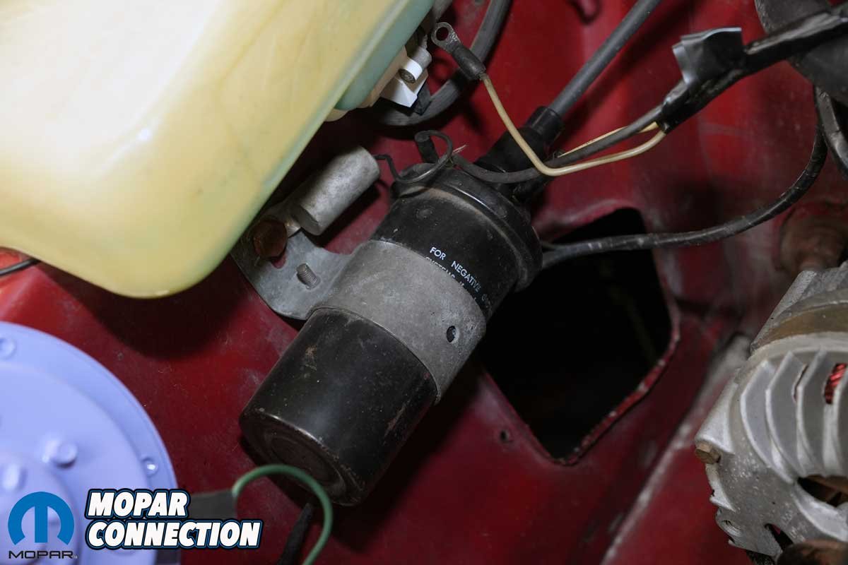 Above: A few things in the engine bay are incorrect. The Road Runner has an electric fuel pump, and the factory fuel lines for the carburetors are hacked up to accommodate a Holley pressure regulator. The positive battery cable is in rough shape. The ignition coil has been moved under the washer reservoir, and the heater hose brackets (two) are missing. Lastly, the radiator hoses are extremely old and soft, and the radiator cap cannot hold pressure, which is probably good because of the hoses’ condition. All of these errors will be repaired in short order.