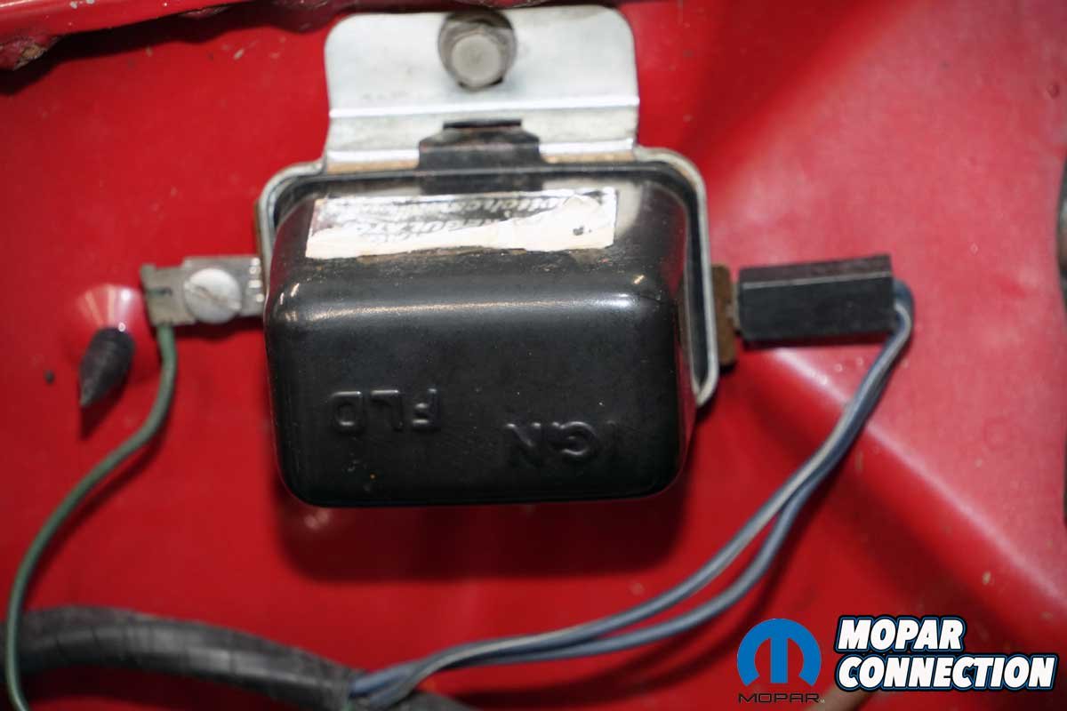 Above Left: The coil currently resides under the washer reservoir. The loose wire is a tachometer lead, but the ‘Runner does not have a tach, so it will be taped back when the coil is moved back to its correct location. Above Center: The voltage regulator in the car is functional, but it is not the OEM. It will be replaced when a correct unit is found. Above Right: The ballast resistor has the correct part number for a 1968 RR.
