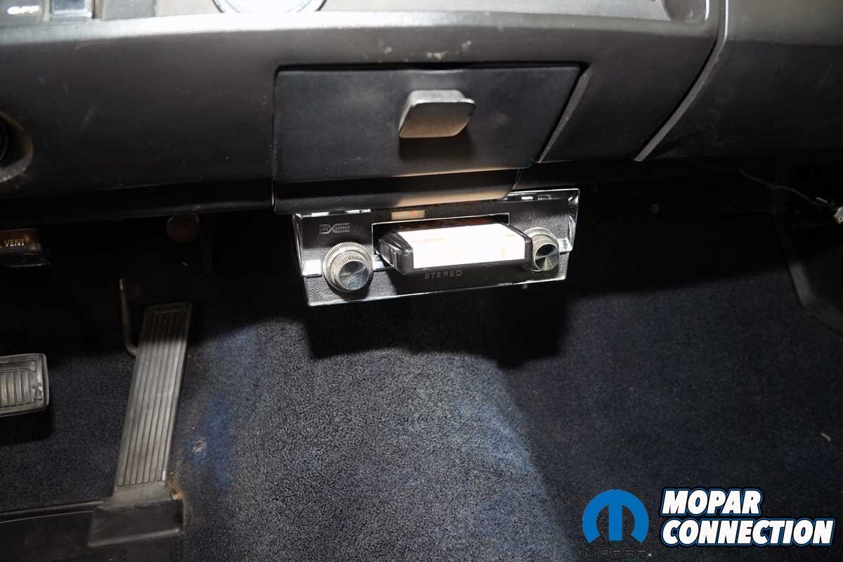 Above Left: Inside the glovebox is a sticker for 24-hour towing from Dom Morino’s Colony Chrysler, Plymouth (and Imperial). Above Right: Although cool for nostalgia, the 8-track player, which operates correctly, will be deep-sixed. The Road Runner purchase included two boxes of 8-track cartridges.