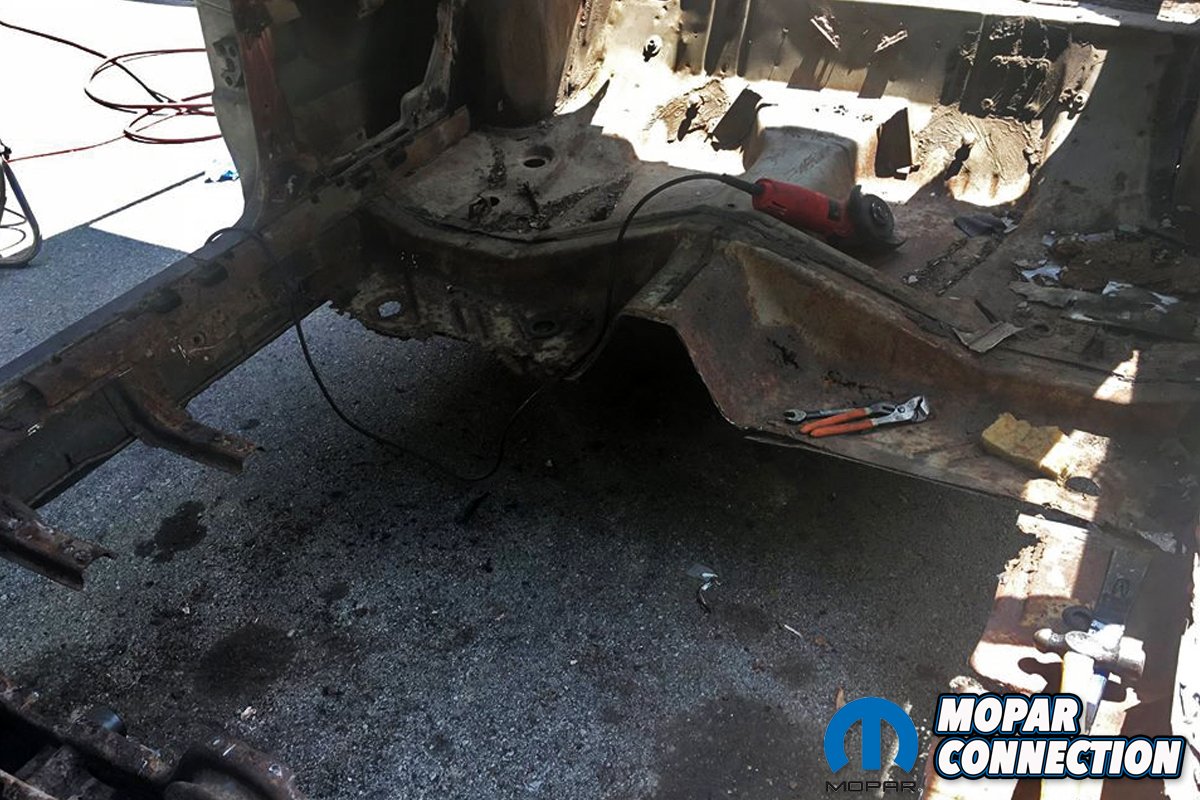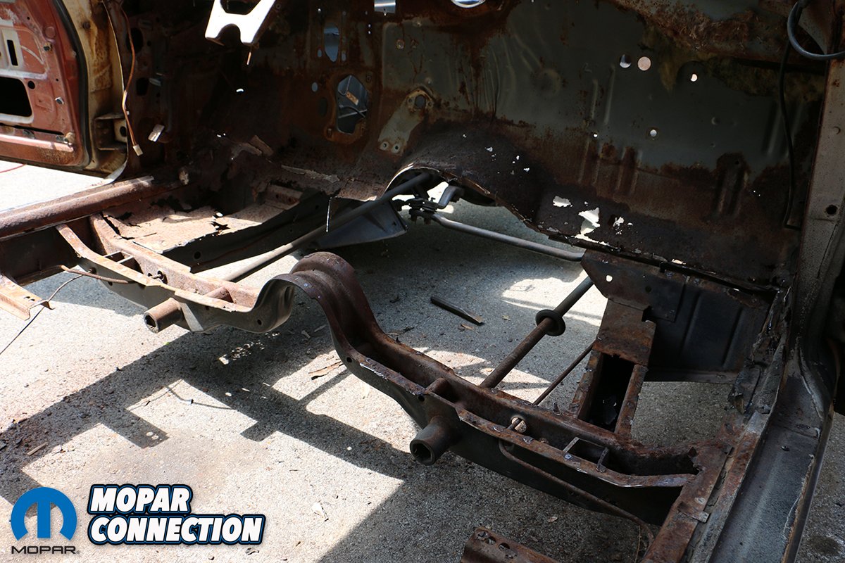 The Rallye dashboard came out with not too much of a fight, it’s rotted metal frame tattered and frayed. Sadly, the frame is all but destroyed requiring us to find a replacement. The factory fuel and brake lines, emergency brake cable and pedal, proportioning valve and exhaust hangers were next. Bill Crabtree of the AMD Installation Center & Classic Muscle Metal was quick to council: “Get that car off of its suspension. Pull all of that stuff out as quick as possible. Those cars were assembled with no weight on the subframes. If you want it to weld together straight and even, it’s gotta be bare.”