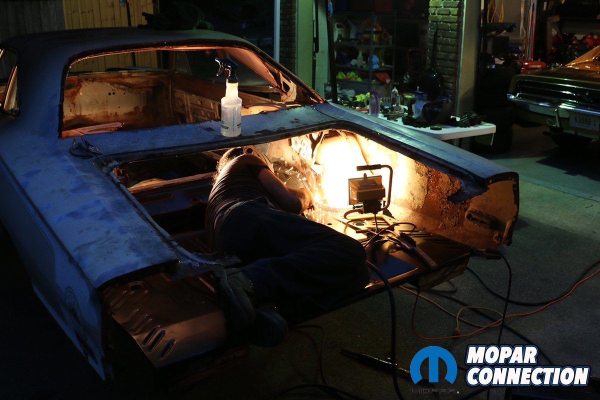 To the observer, there’s still a lot of rot to be cut out; the lower half of the firewall insists on being replaced. So too does the butchered package tray and cancerous lower rear window valance. Repairing the quarter panels will require some doing, as complete ’70 Coronet quarters aren’t available through the aftermarket (only the side skins are). We’ve found a few replacement tail panels and should have it and a new rear cross member shortly. In all, ZomBEE has proven more difficult than initially expected but not impossible. As new, fresh metal is stitched in, I’ll be able to pull more rotted steel out. Without the precision tables and pre-fabbed support structures of the AMD Installation Center on hand, cutting everything out at once and piecing it back together would prove disastrous.