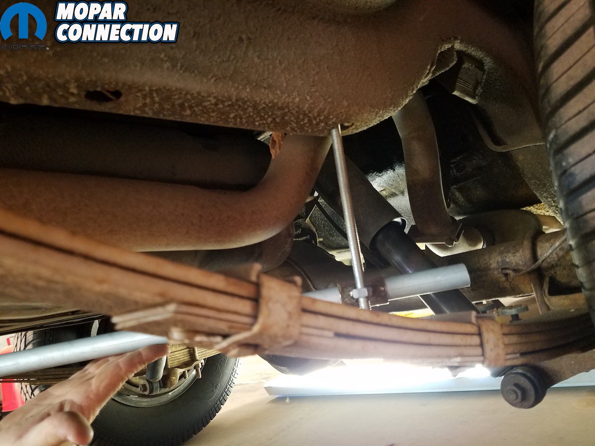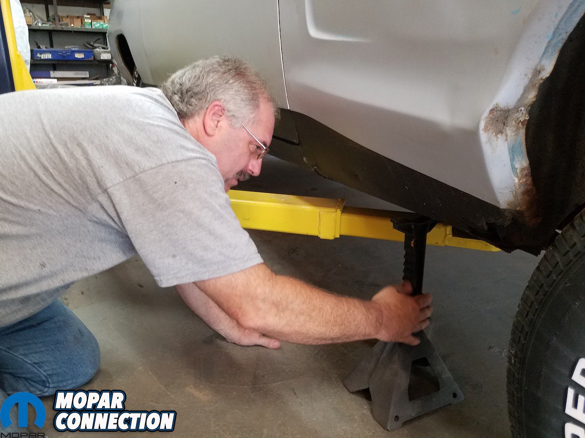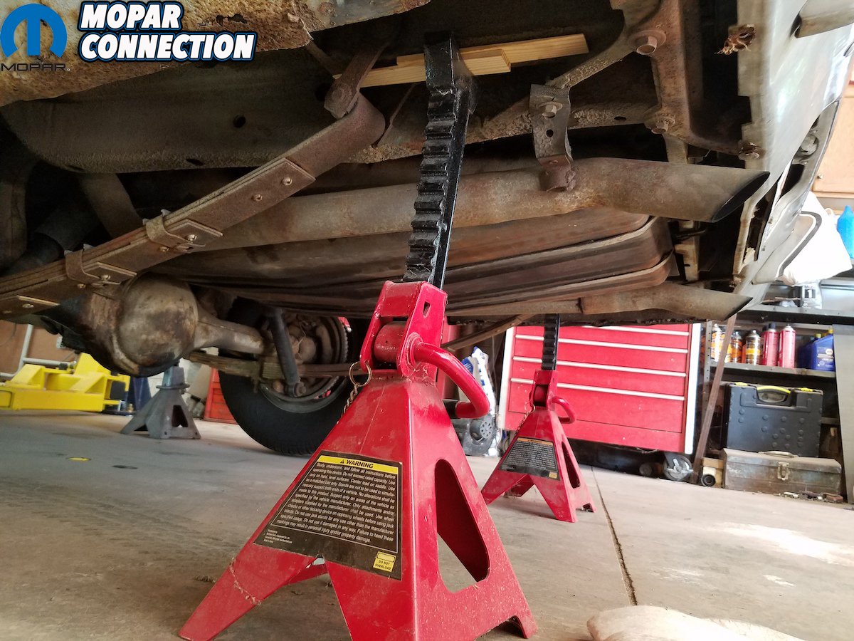 Above: The rear jack stands are set primarily to prevent rear frame rail sag. We used door frame shims to take up slack to it stays tight. Note we used shims on both sides.
