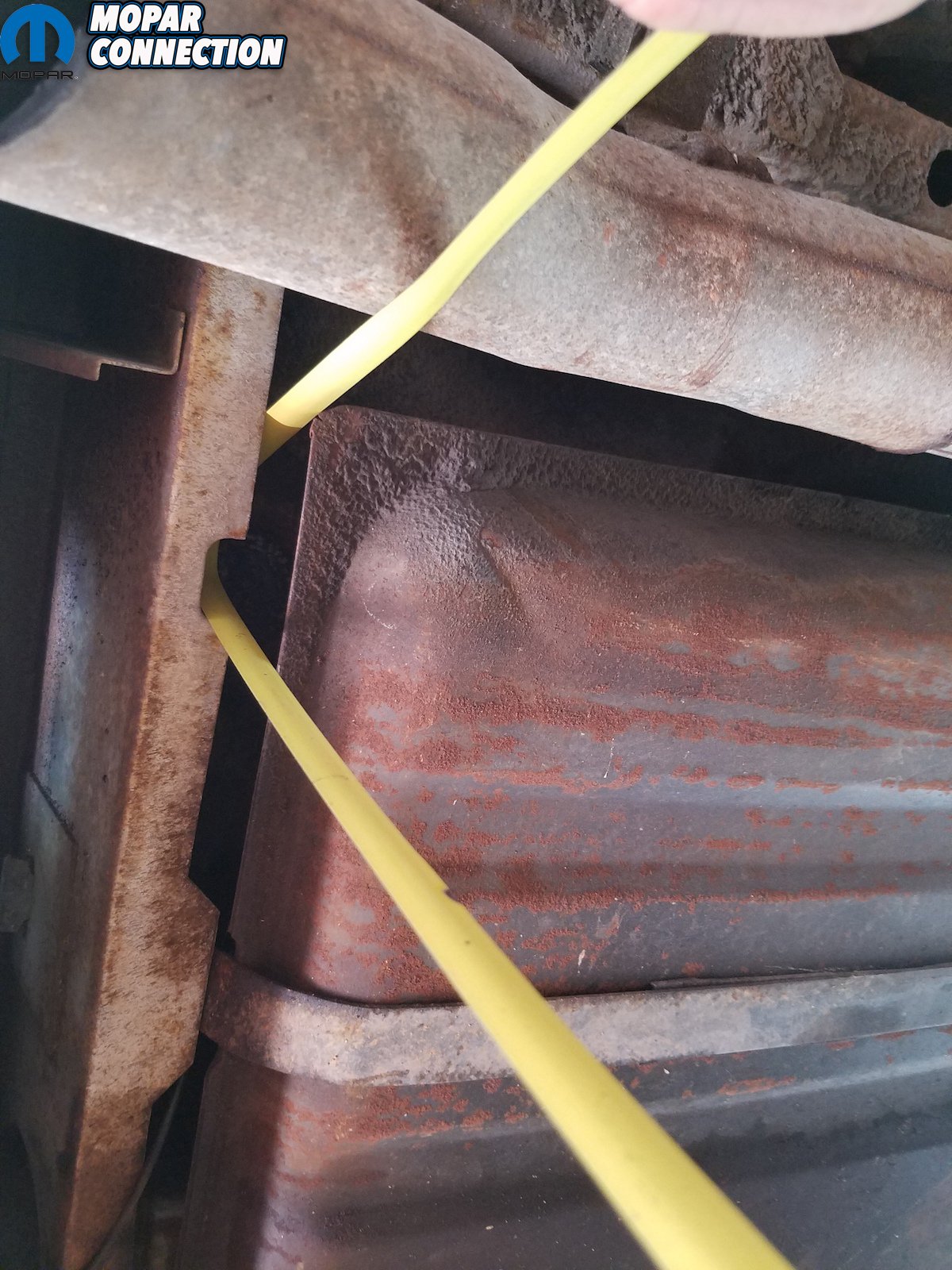 Above left: Using a tape to measure from the bottom of the pinch weld to the floor, record those measurements so you can reference them as you work on the car – and make sure to measure all 4 corners. Above center: Take the floor-to-rear cross member height measurement. These cars were built asymmetrical, so find a cut out or a hole on the rear cross member – a point you can find on both sides – that you can measure both frame rails individually. Above right: We used this notch to use as a reference point.