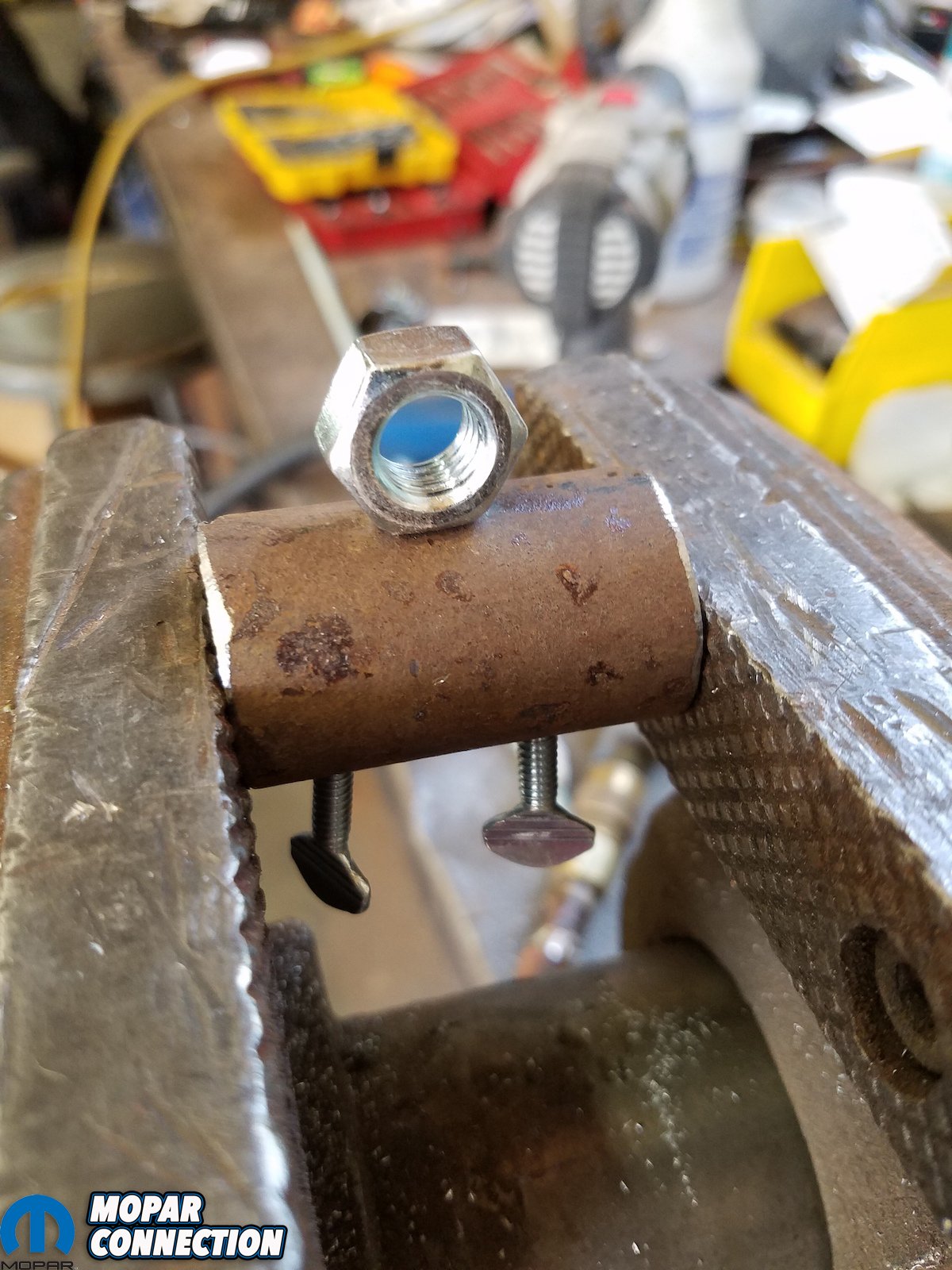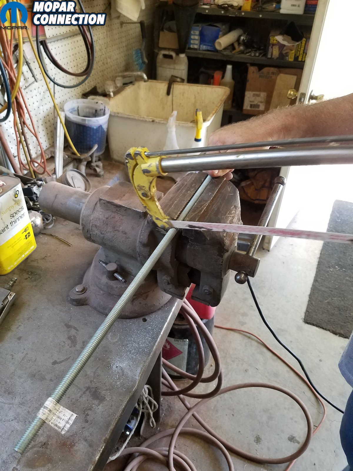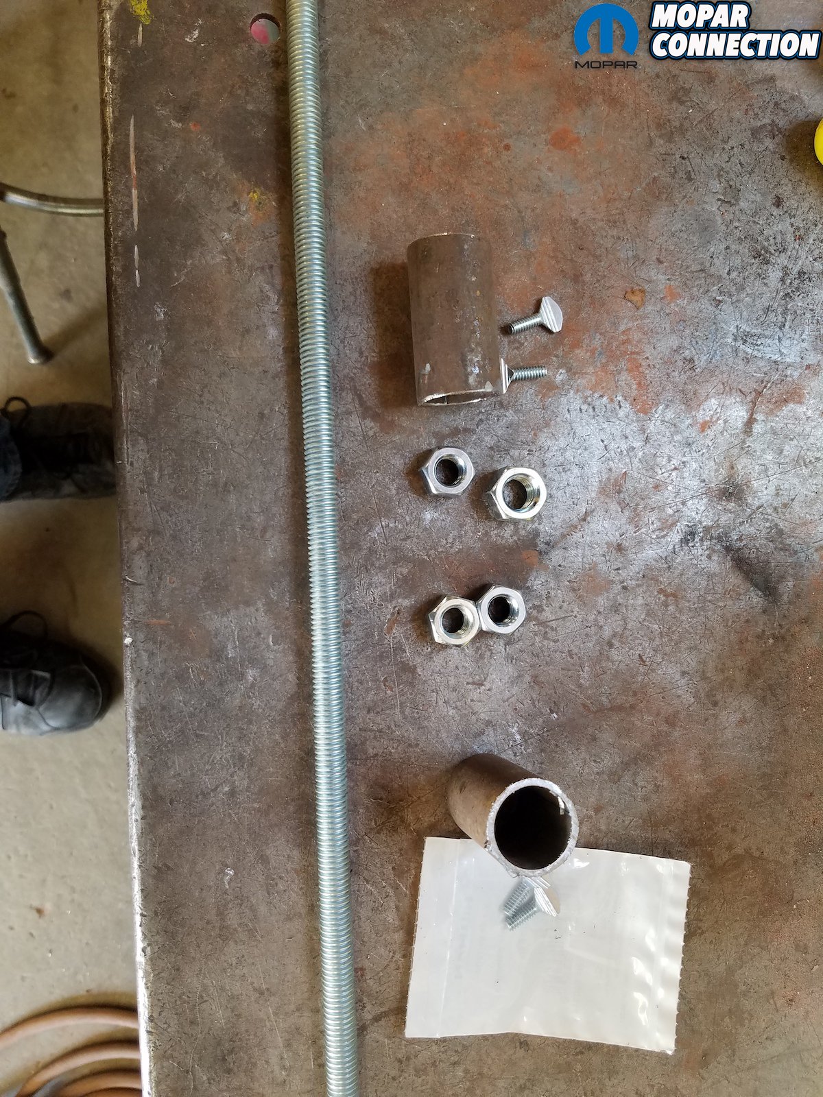Top: Next, Dave welded one of the 7/16-inch nuts to the tubing perpendicularly (180-degrees). Bottom: Then we cut threaded rod in half into two 1-foot pieces. Then slide on the piece of conduit.
